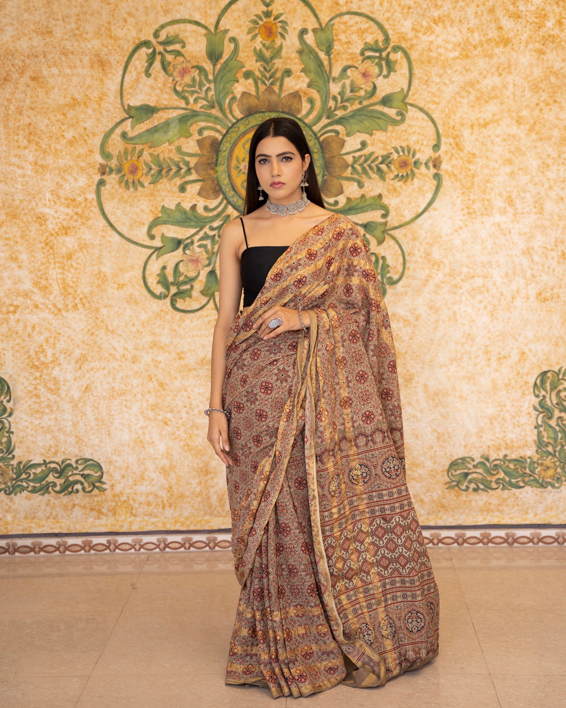 This intricate and exclusively Ajrakh saree is hand crafted by the master craftsman using natural dyes. The making of Ajrak cloth is a long 16 - steps process and one step being performed in a each day and fabric being put to rest for a day. It is hard to believe that our artisans has used rusted iron to create dye for this saree. This all season saree is an essential pick for your ethnic wardrobe.