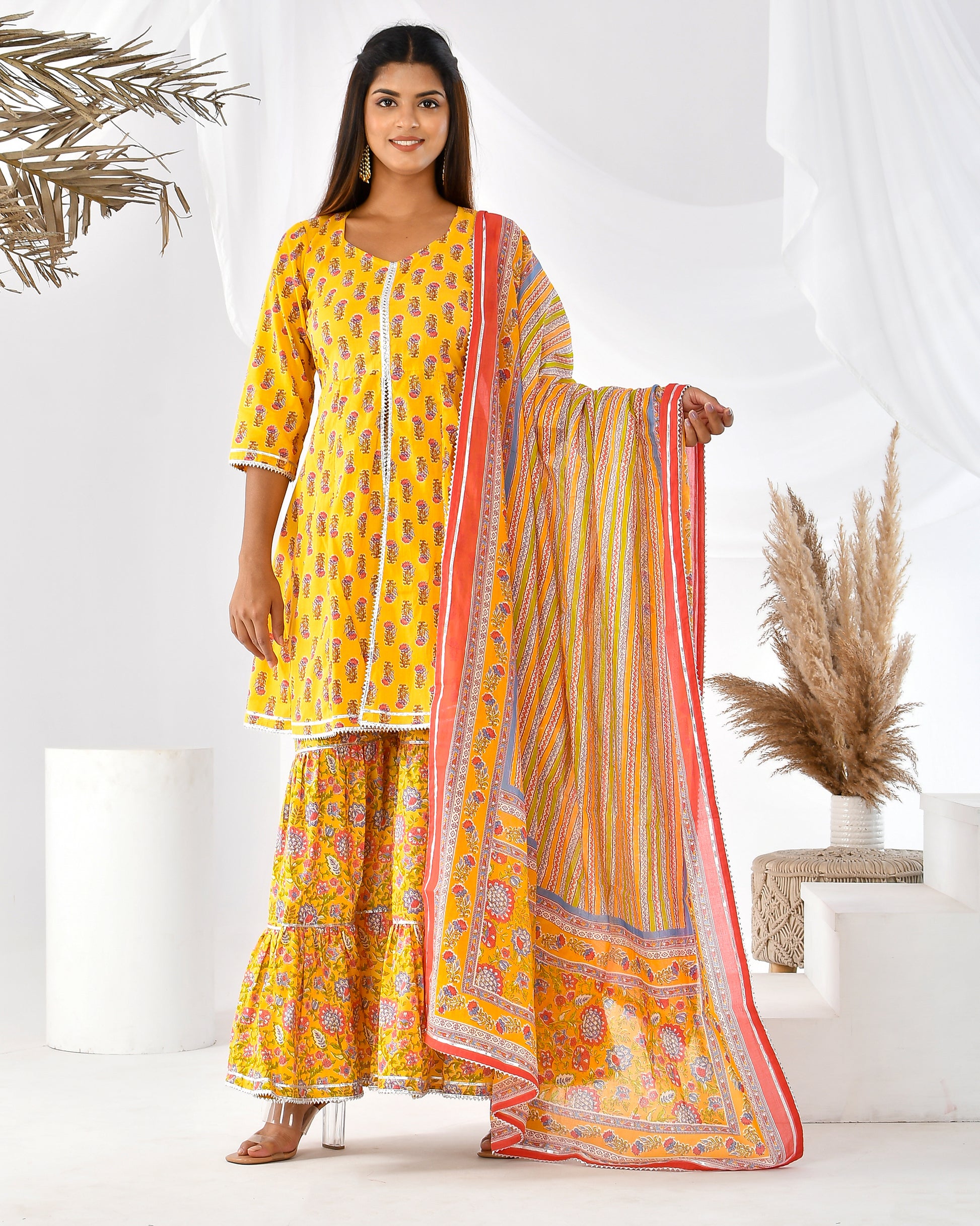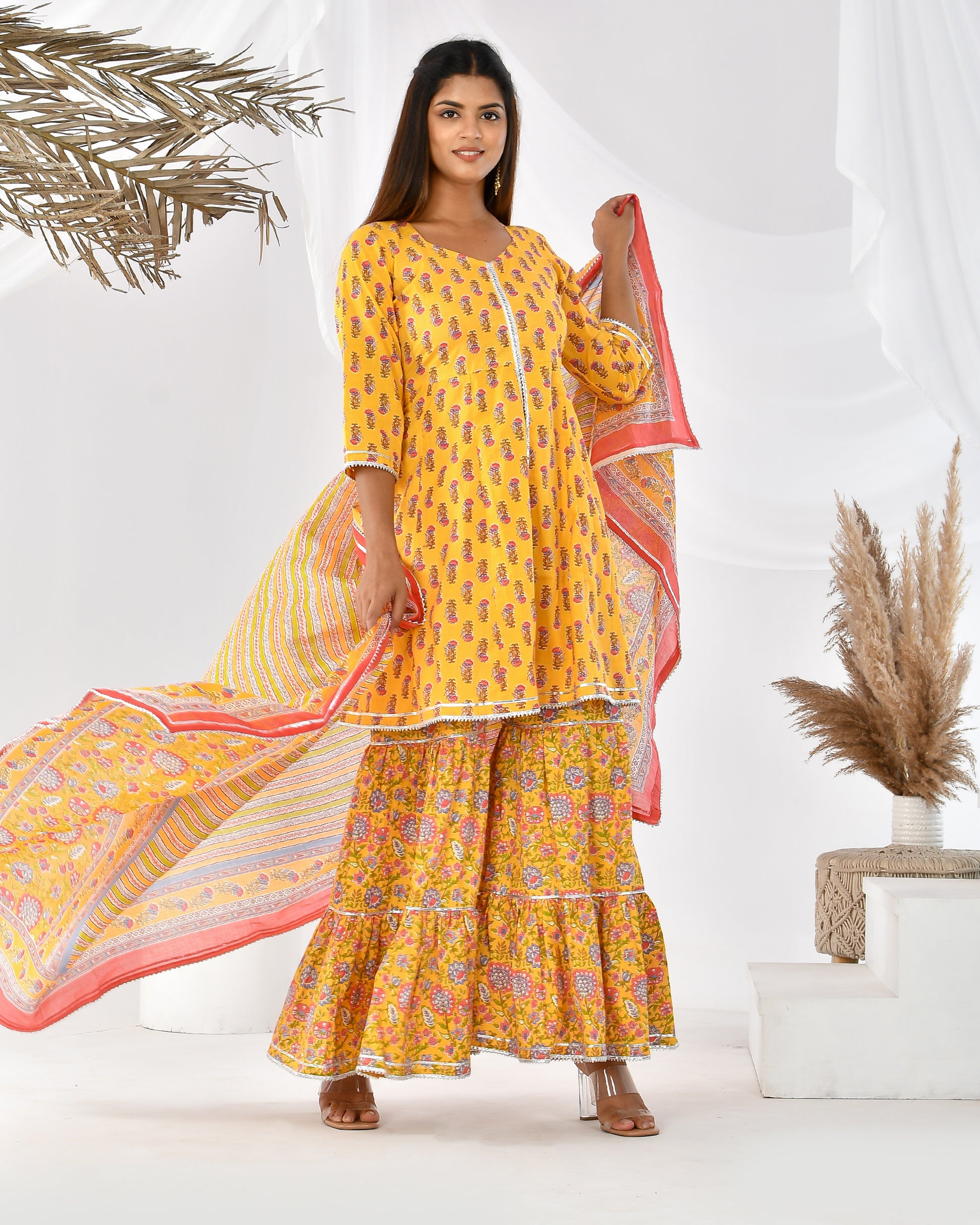 Anika yellow sharara set includes kurta, sharara & dupatta. It is a perfect outfit for celebrations & events. Refreshing yellow hues and exquisite floral prints make this sharara set a must have summer outfit.