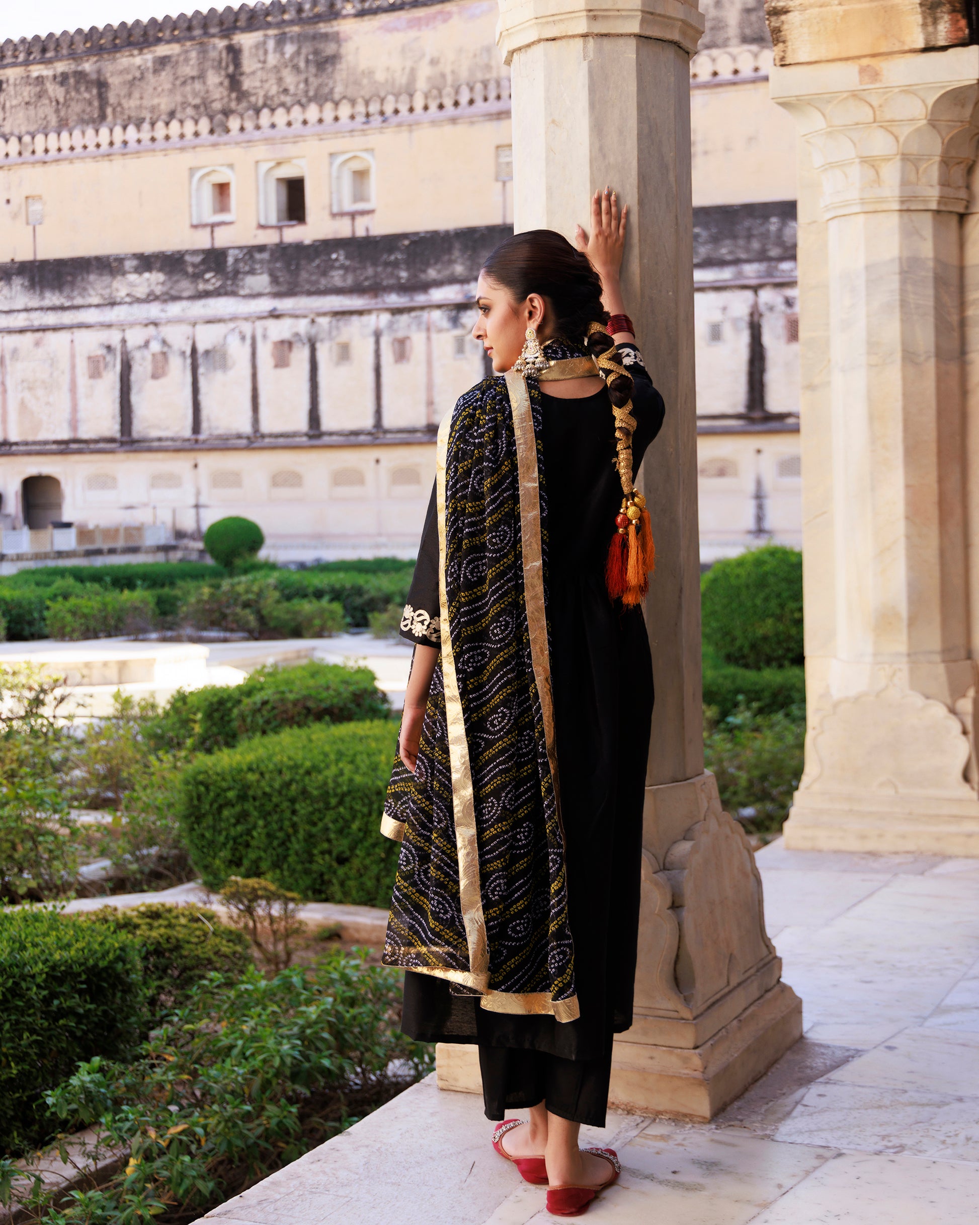 This elegant kurta set features handcrafted black Gota Patti work on luxurious Dupion silk, exuding a sophisticated charm. The set includes a Bandhani printed dupatta, adding a touch of traditional flair. Elevate your style with this beautifully crafted and versatile ensemble.