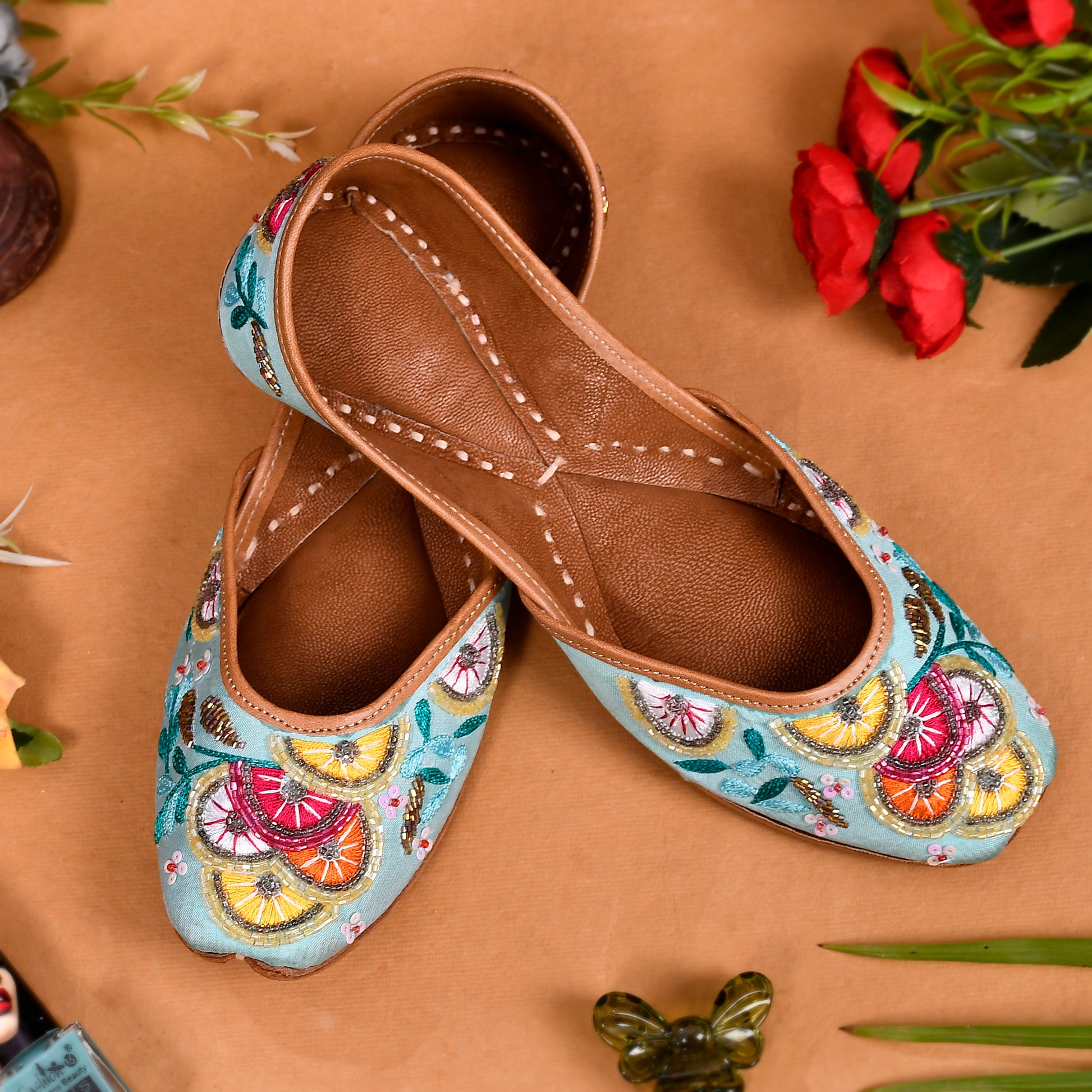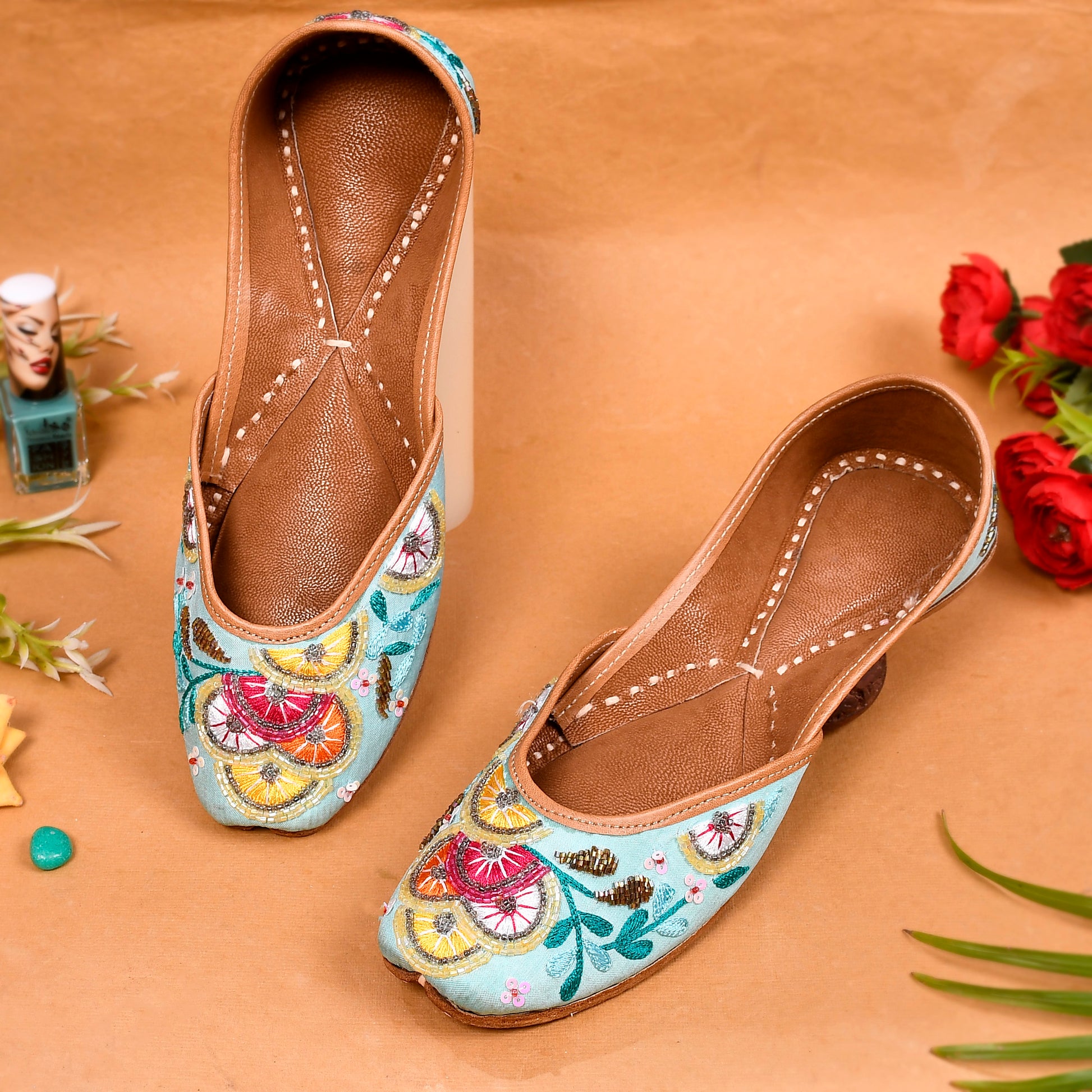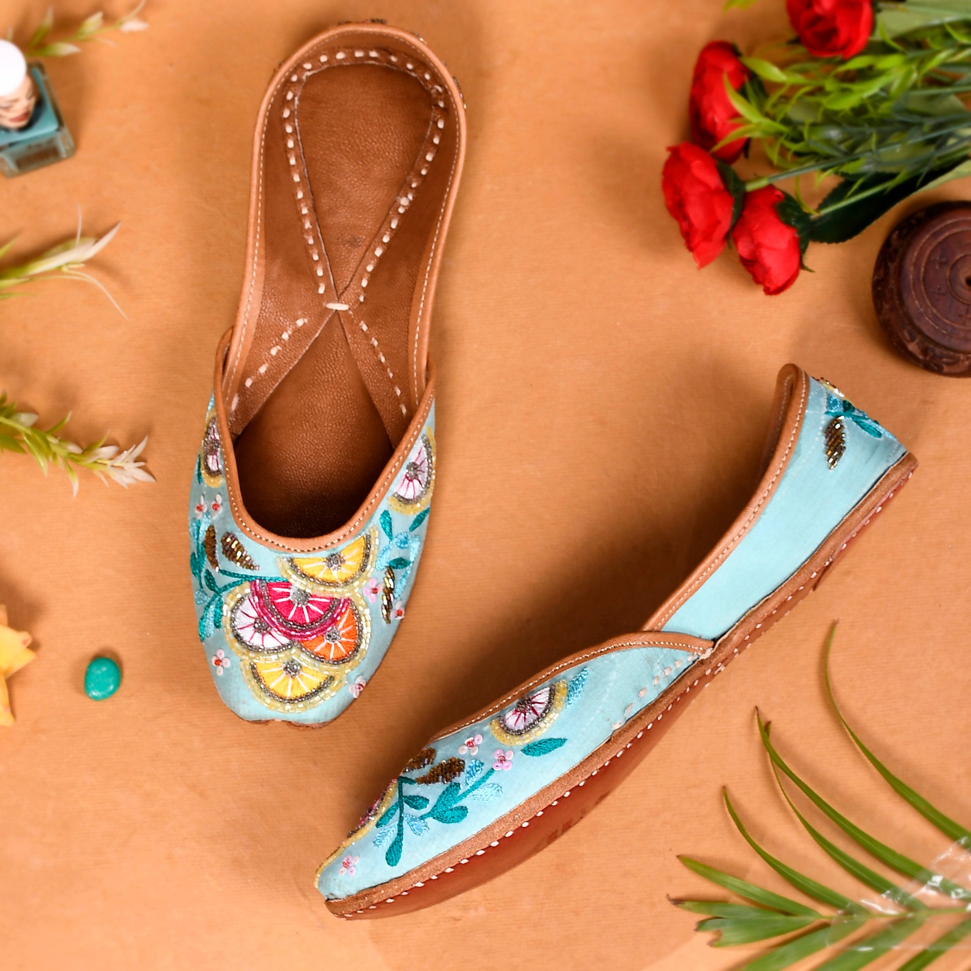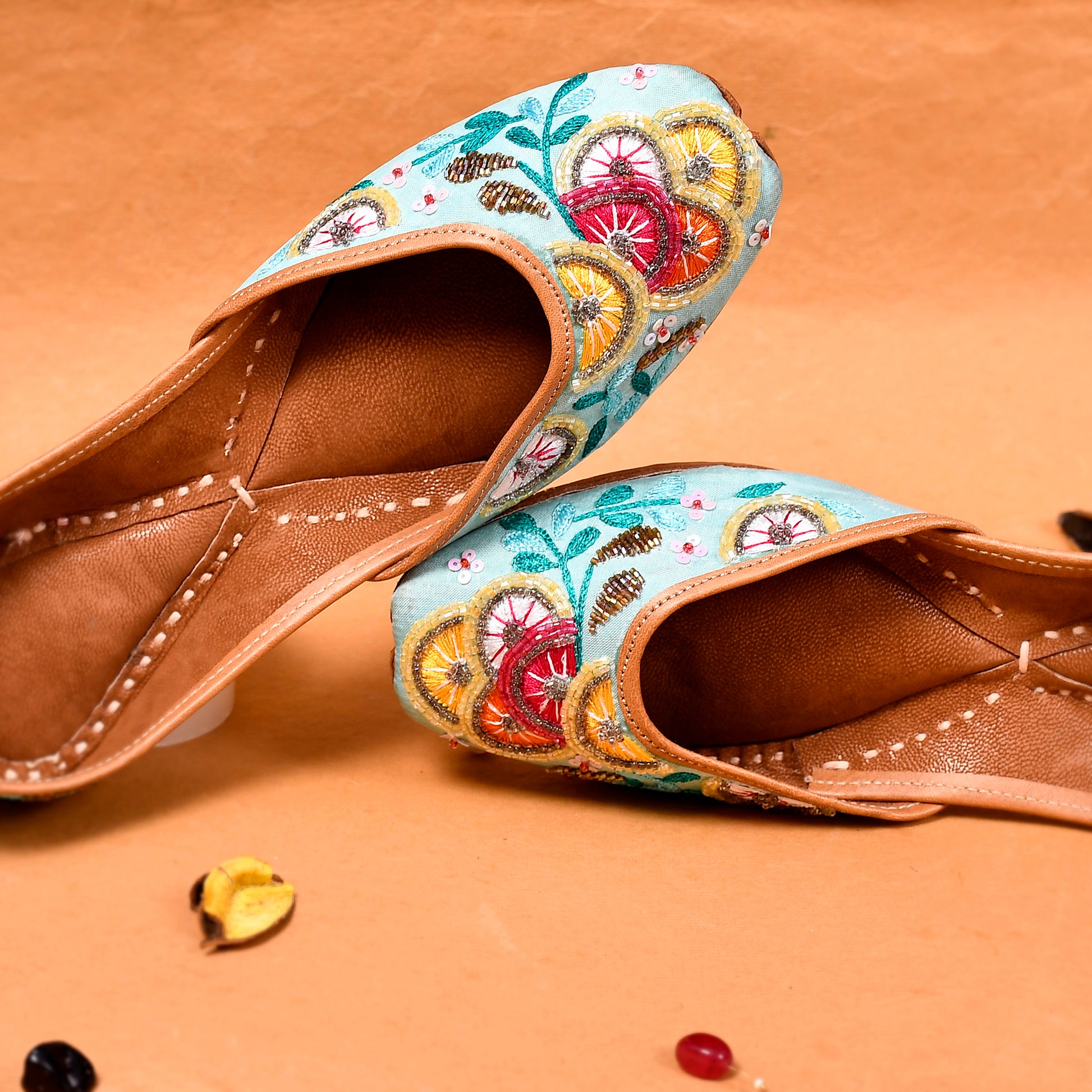 Hand embroidered with love by the master artisans ,these juttis are crafted to complete your boho look. Aqua blue colour juttis crafted with contrast colour embroidery all over. Style these with your jeans or your ethnic outfit and be a Stunner .