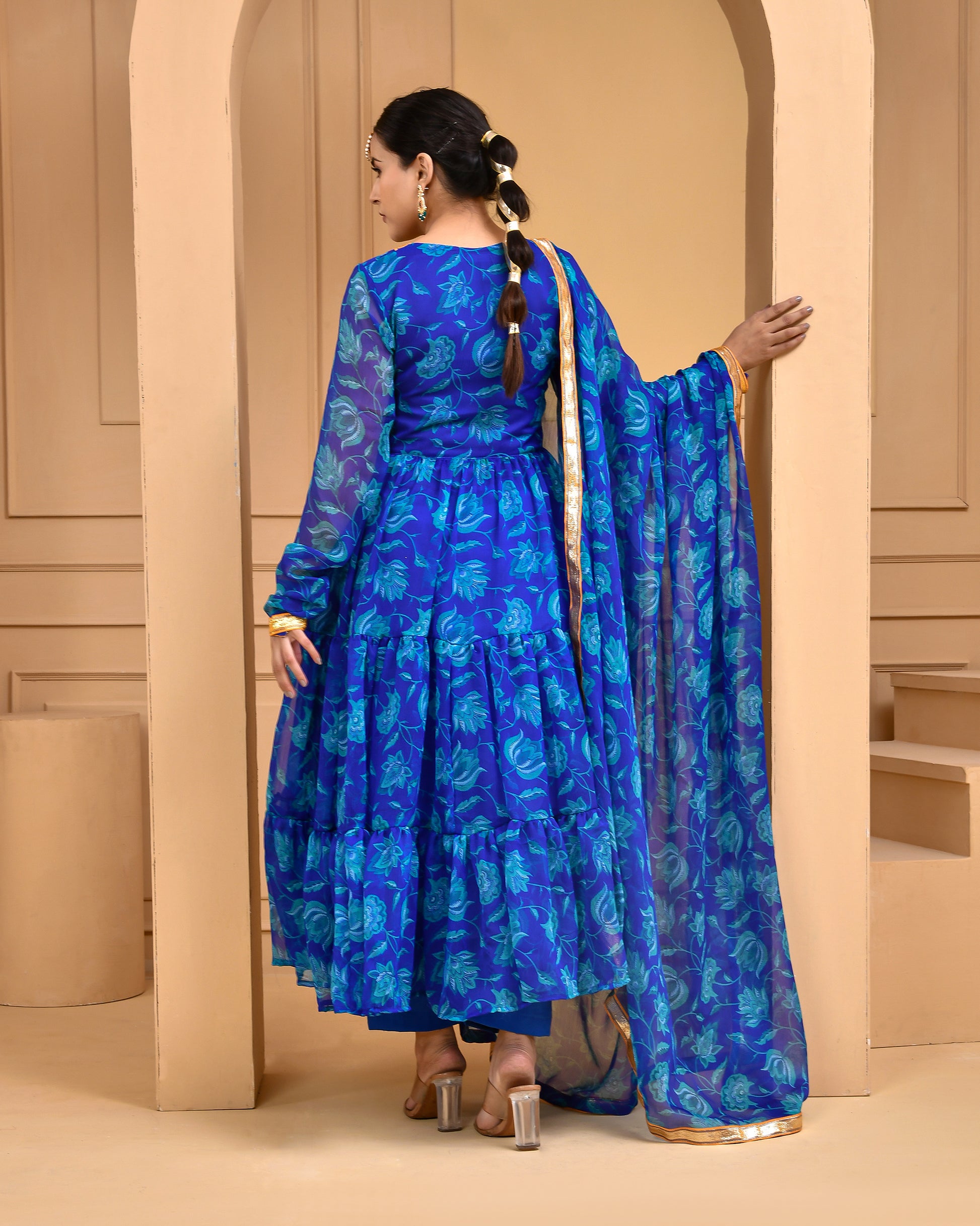 This Blue Printed Chiffon Anarkali Set is a stunning and versatile addition to any wardrobe. Made from high-quality printed chiffon, it features a layered design and intricate gota lace work for a unique and elegant look. The flared silhouette flatters any body type and adds a touch of femininity to your overall style. Perfect for any occasion, this set is a must-have for those who appreciate timeless beauty and impeccable craftsmanship.