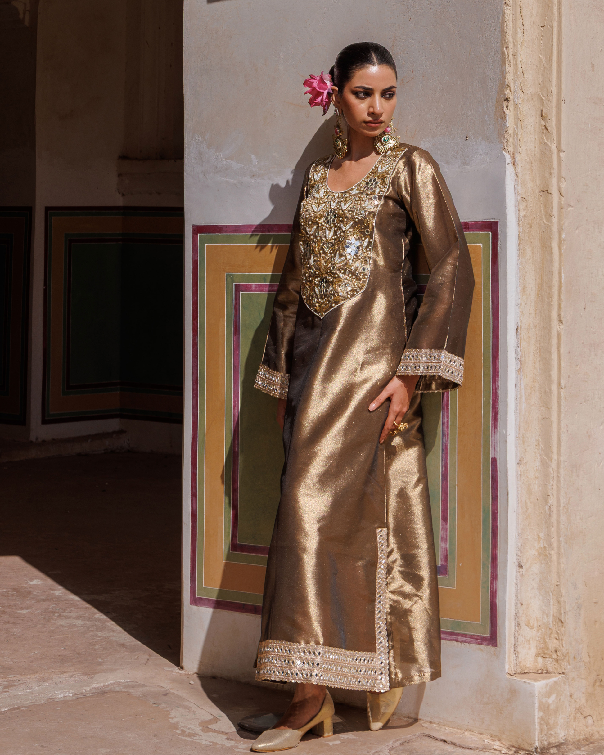 This brown metallic tissue kaftan combines traditional hand embroidery with contemporary design. Its long silhouette is enhanced by side slits featuring intricate mirror lace details, offering both sophistication and ease of movement. Crafted for those who appreciate fine craftsmanship, this kaftan is perfect for stylish, elegant occasions.
