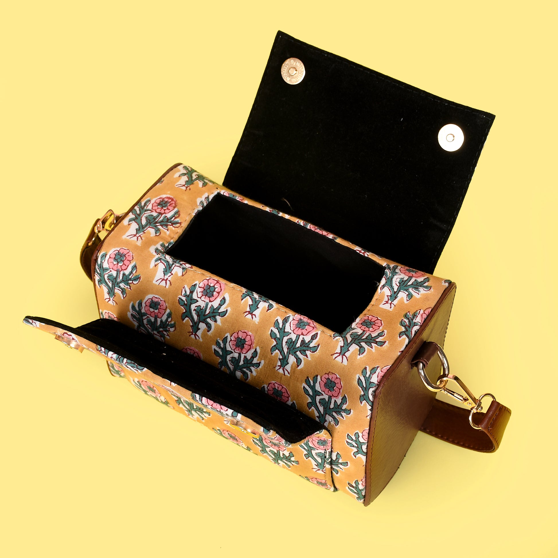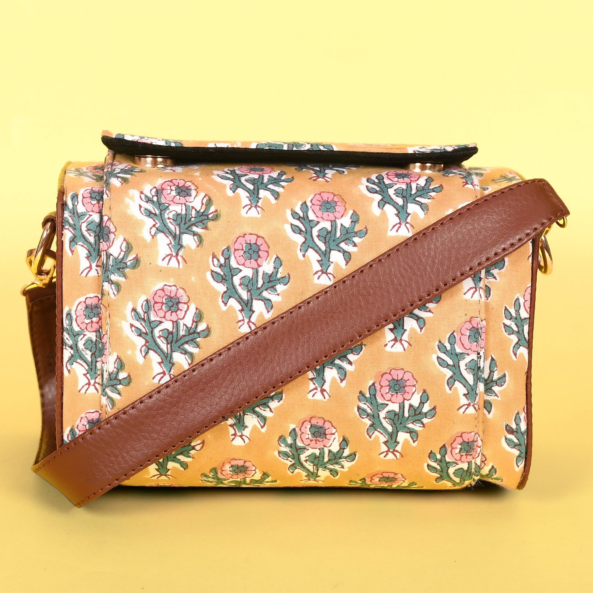 MATERIAL : Hand block printed fabric, vegan leather and premium quality accessories.
