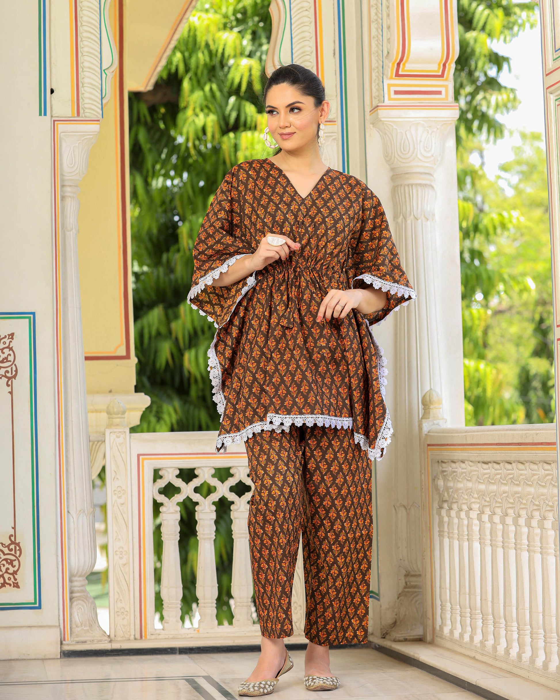You'll look stunning in this CARAMEL CO-ORD SET. Crafted from pure cotton, this chic kaftan offers superior breathability and comfort - perfect for any occasion. The contemporary design will bring timeless elegance and flair to your wardrobe.