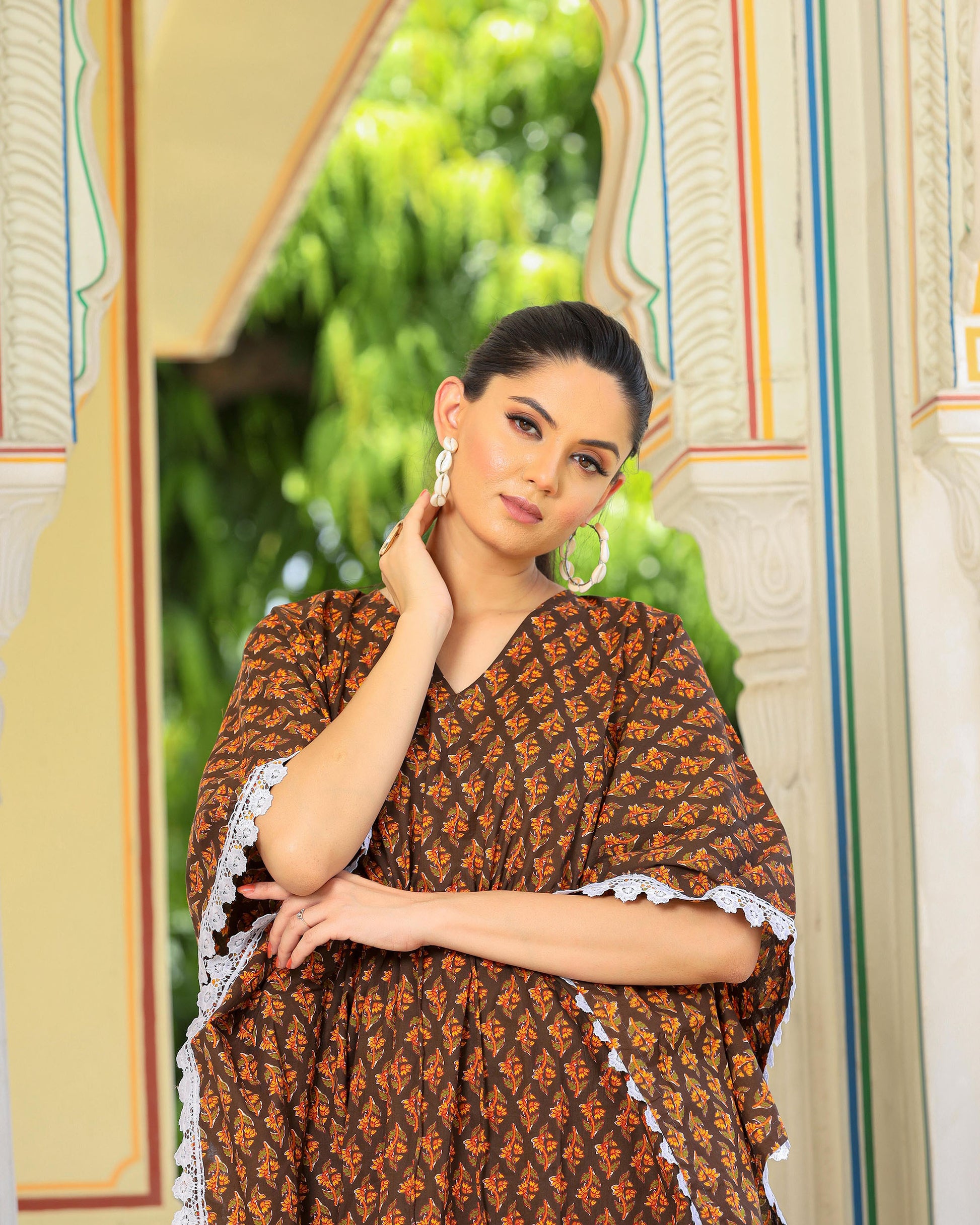 Top description - It's a comfortable cotton, printed kaftan with a delicate crochet lace on its bordes.