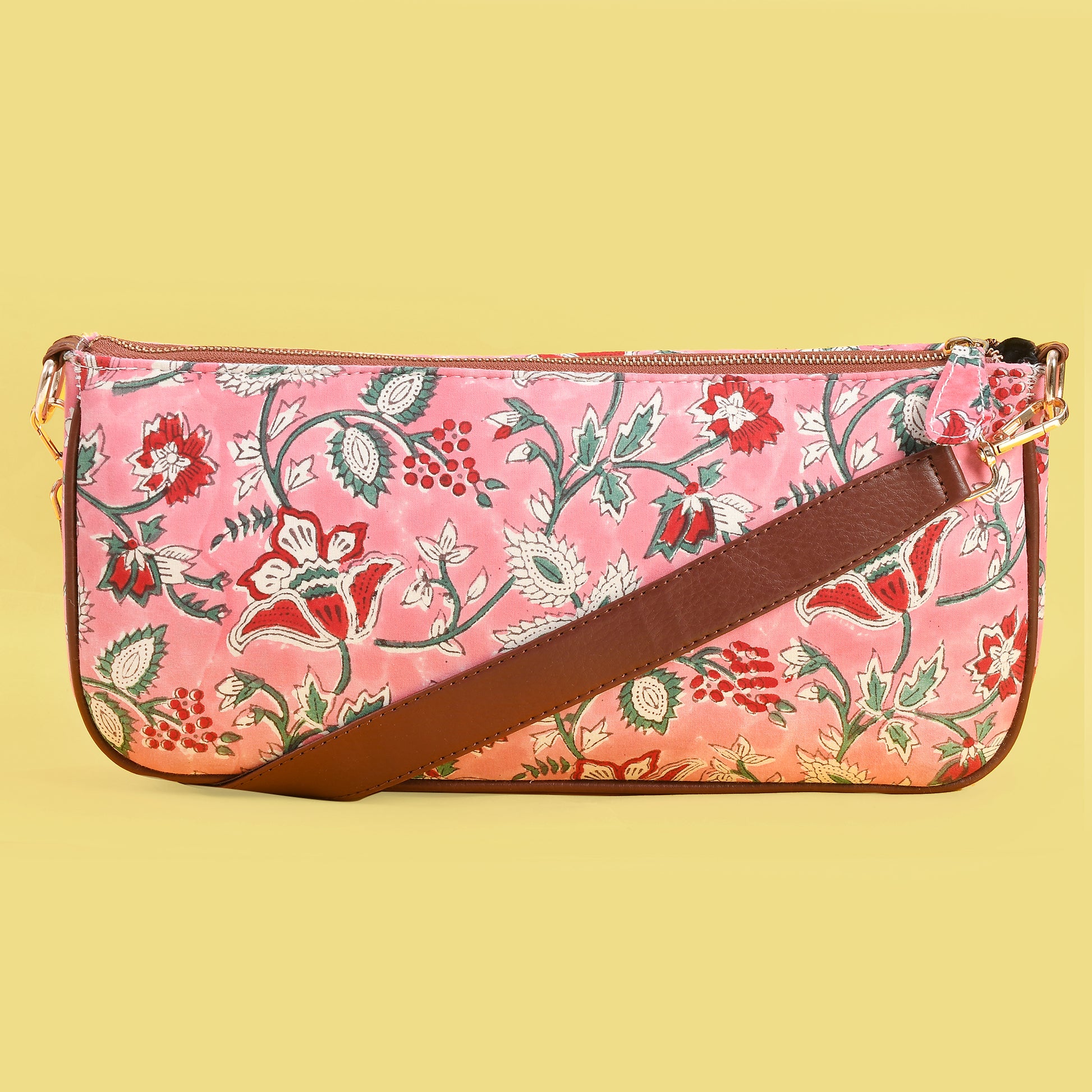 Cosmos pink hand block printed Baguette bag.