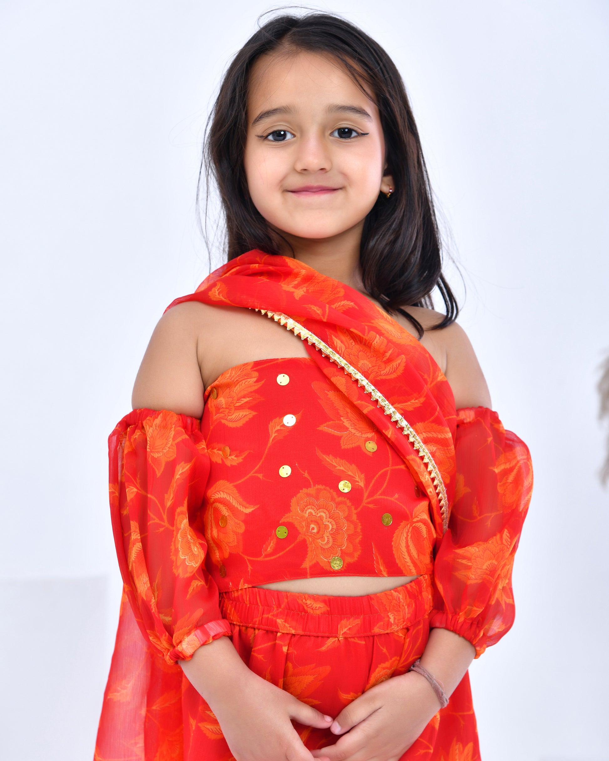 Achieve effortless elegance with our Embellished Blossom Print Pre-Draped Saree. This orange saree features a beautiful blossom print and is pre-draped for your convenience. The elastic waistband ensures a comfortable fit, while the sequin embellished off-shoulder crop top adds a touch of glamour. Perfect for any special occasion.