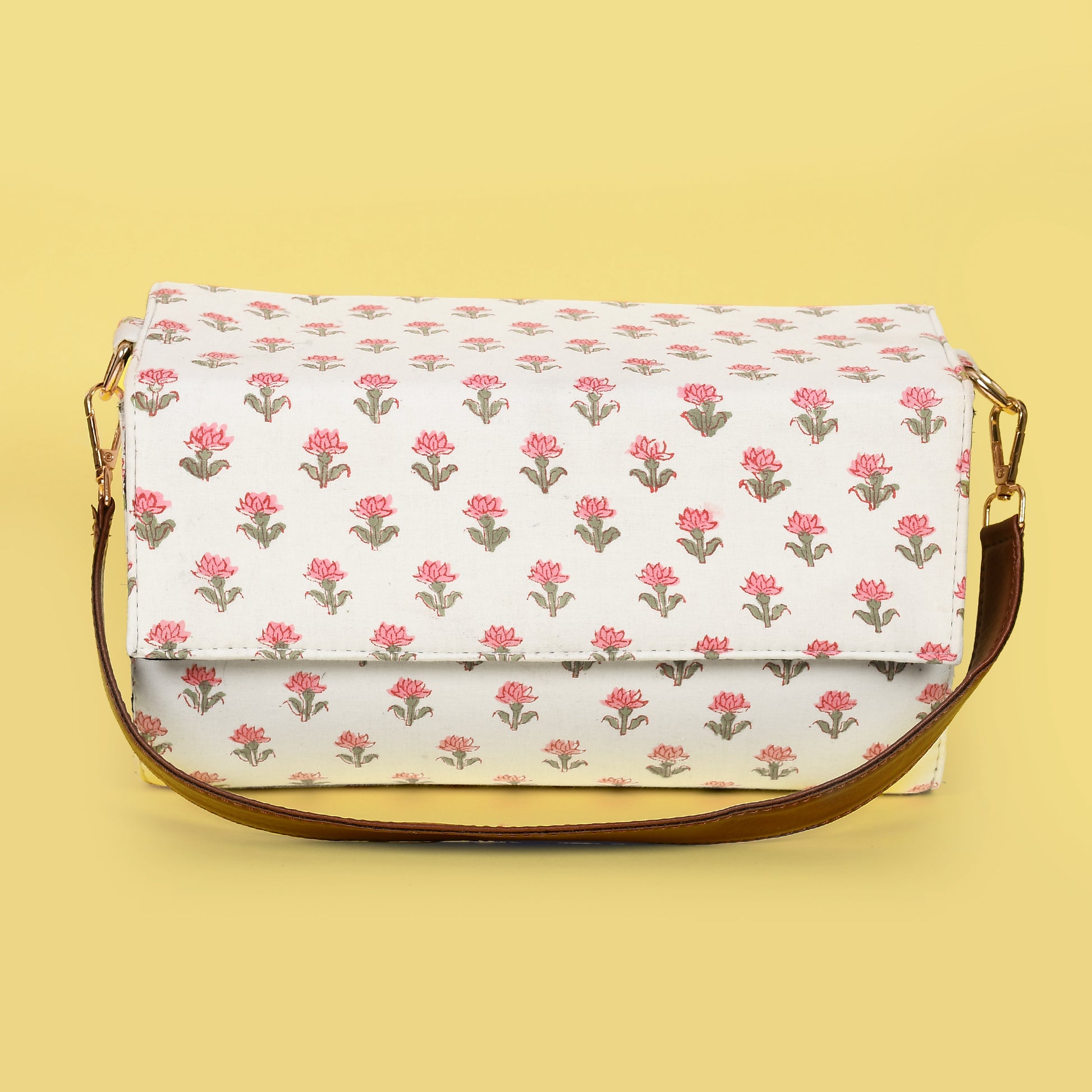 Florence hand block printed, white coloured and pink floral printed bag. It is a super spacious and sophisticated bag, and a must have in your formal and semi formal wardrobe collection.