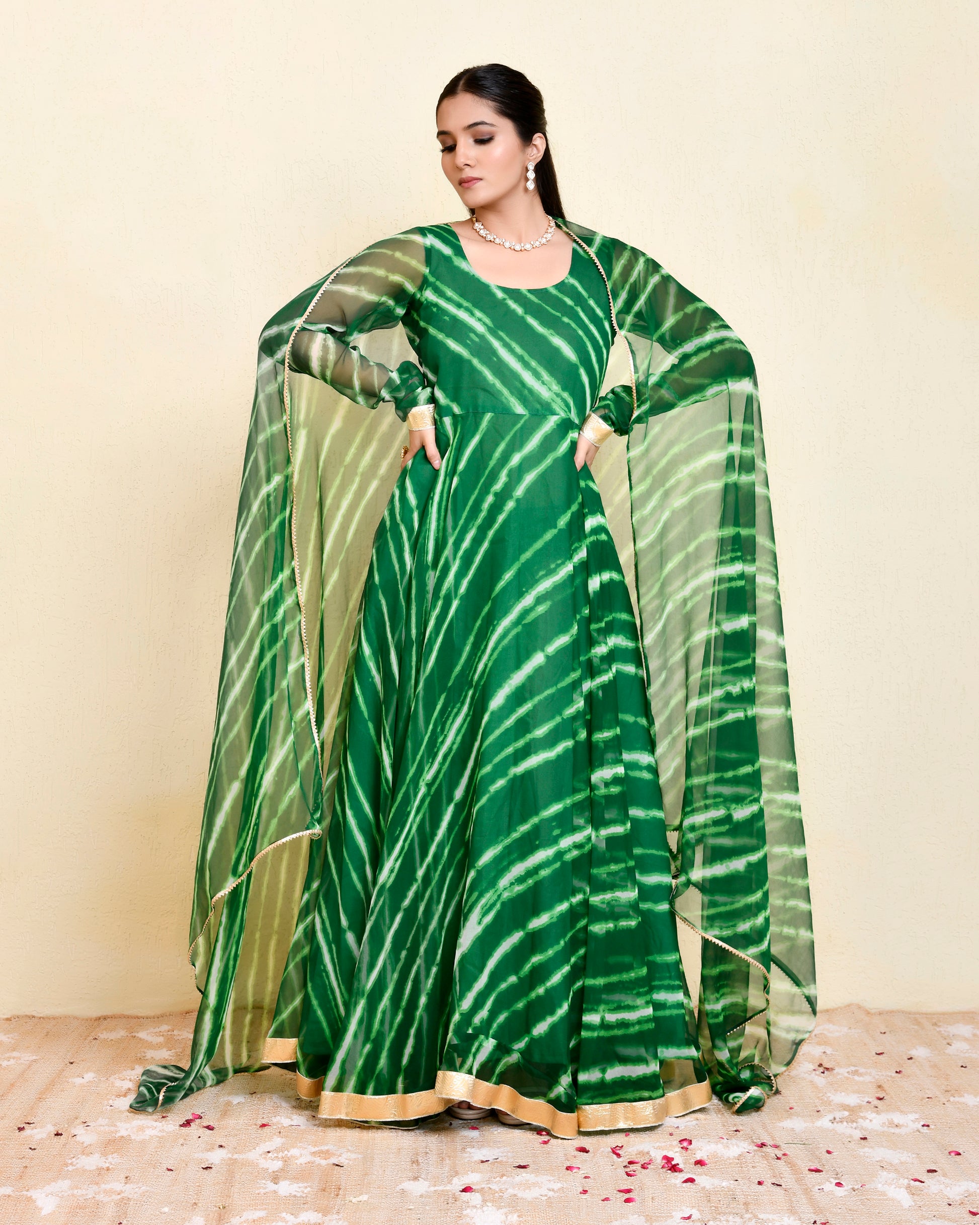 Floor length description : It is a georgette Rajasthani leheriya printed, flared floor length set embellished with gota lace.
