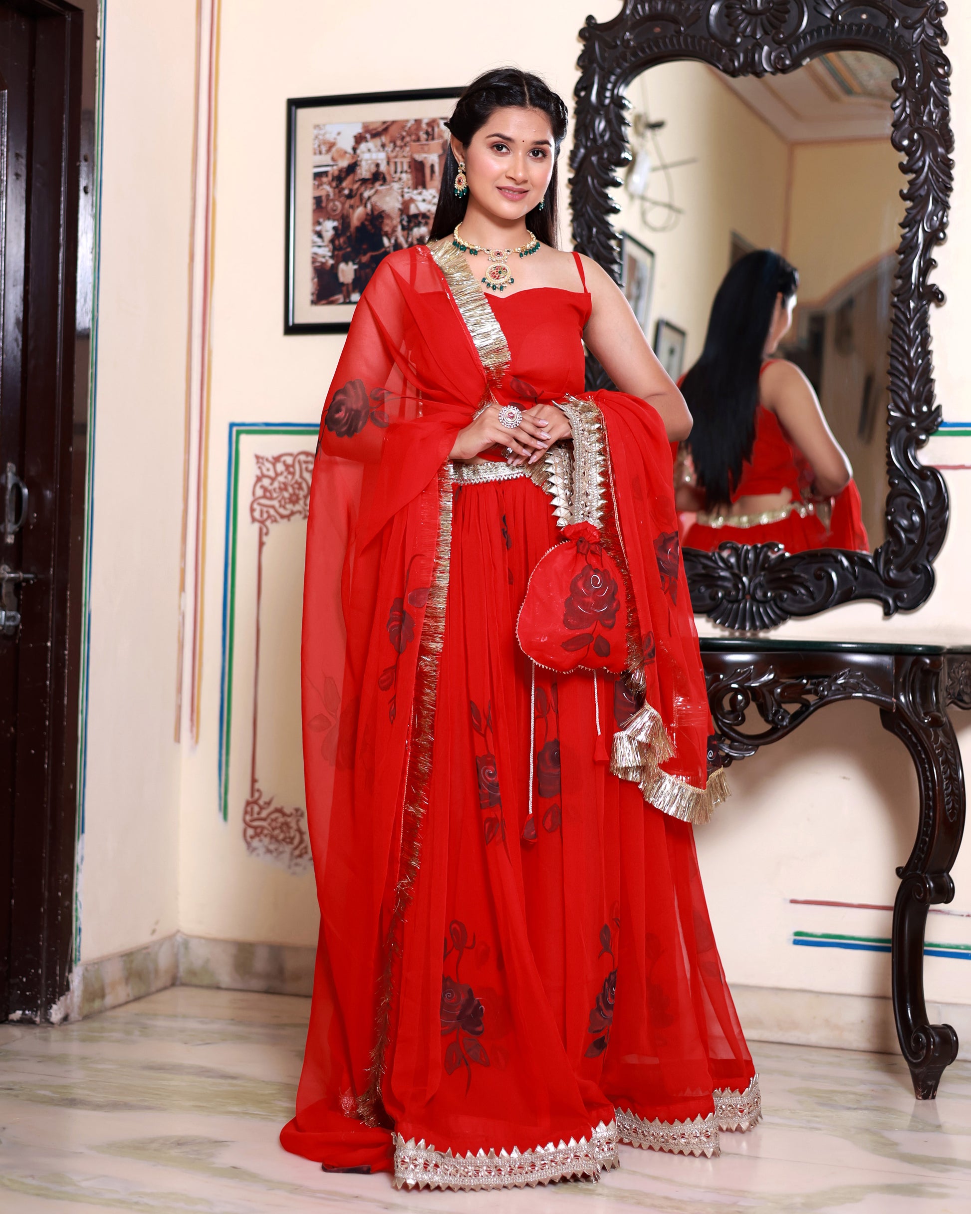 This GAYATRI RED HAND PAINTED LEHENGA SET is perfect for any festive occasion. Crafted with georgette fabric and hand-painted with black roses by artisans, this lehenga set is sure to make you stand out. Flaunt your style with this beautiful outfit.