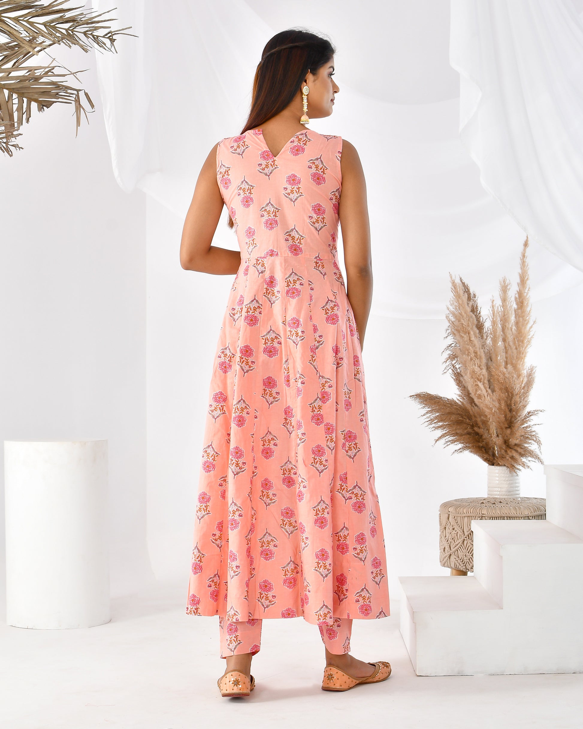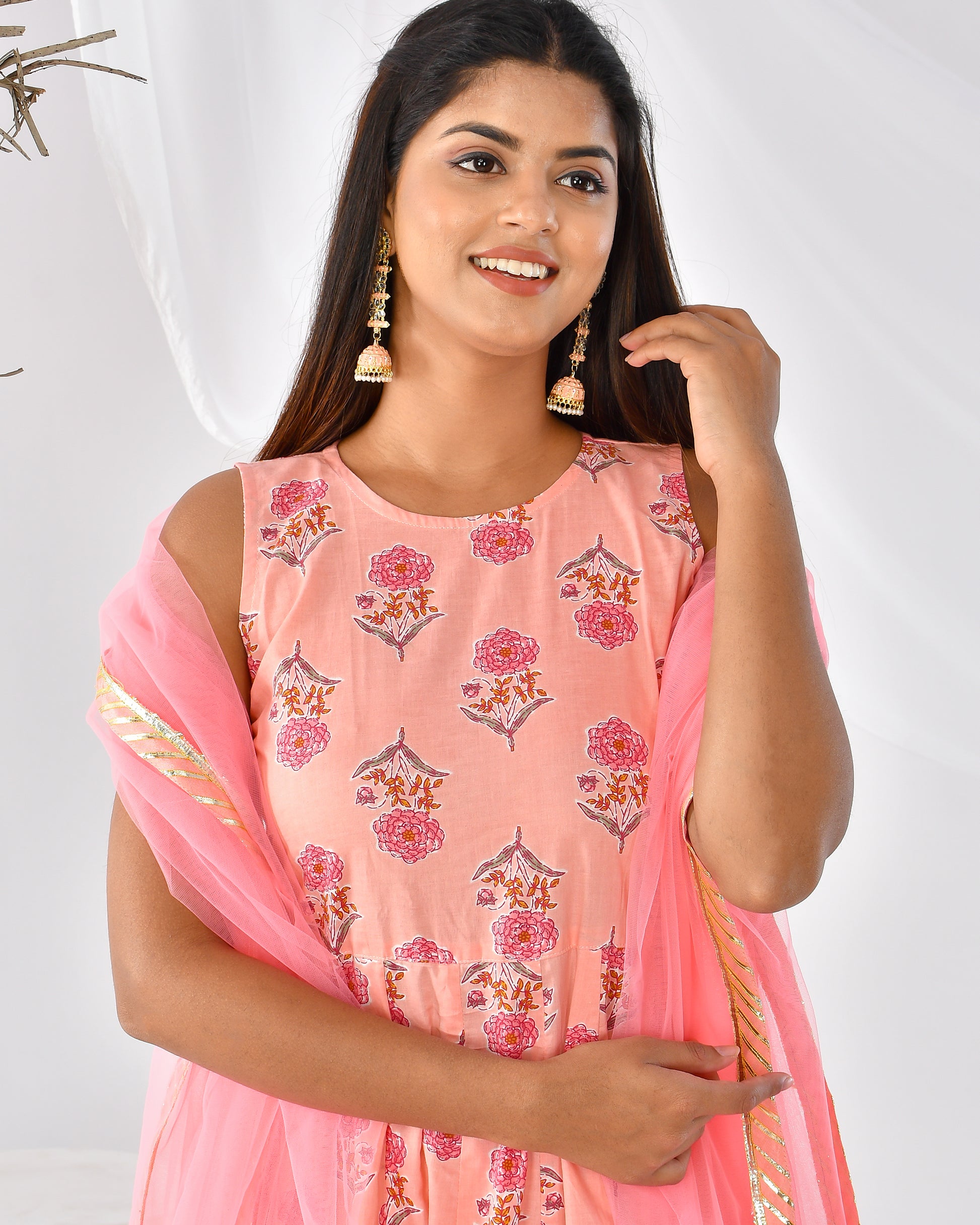 This three piece set comes with a twirl ready flared kurta, pant and a dupatta. It is crafted with beautifully printed cotton fabric. Tailored with perfection, this suit set stands for simplicity and sophistication. Add this breathable cotton outfit to your wardrobe and be summer ready !!