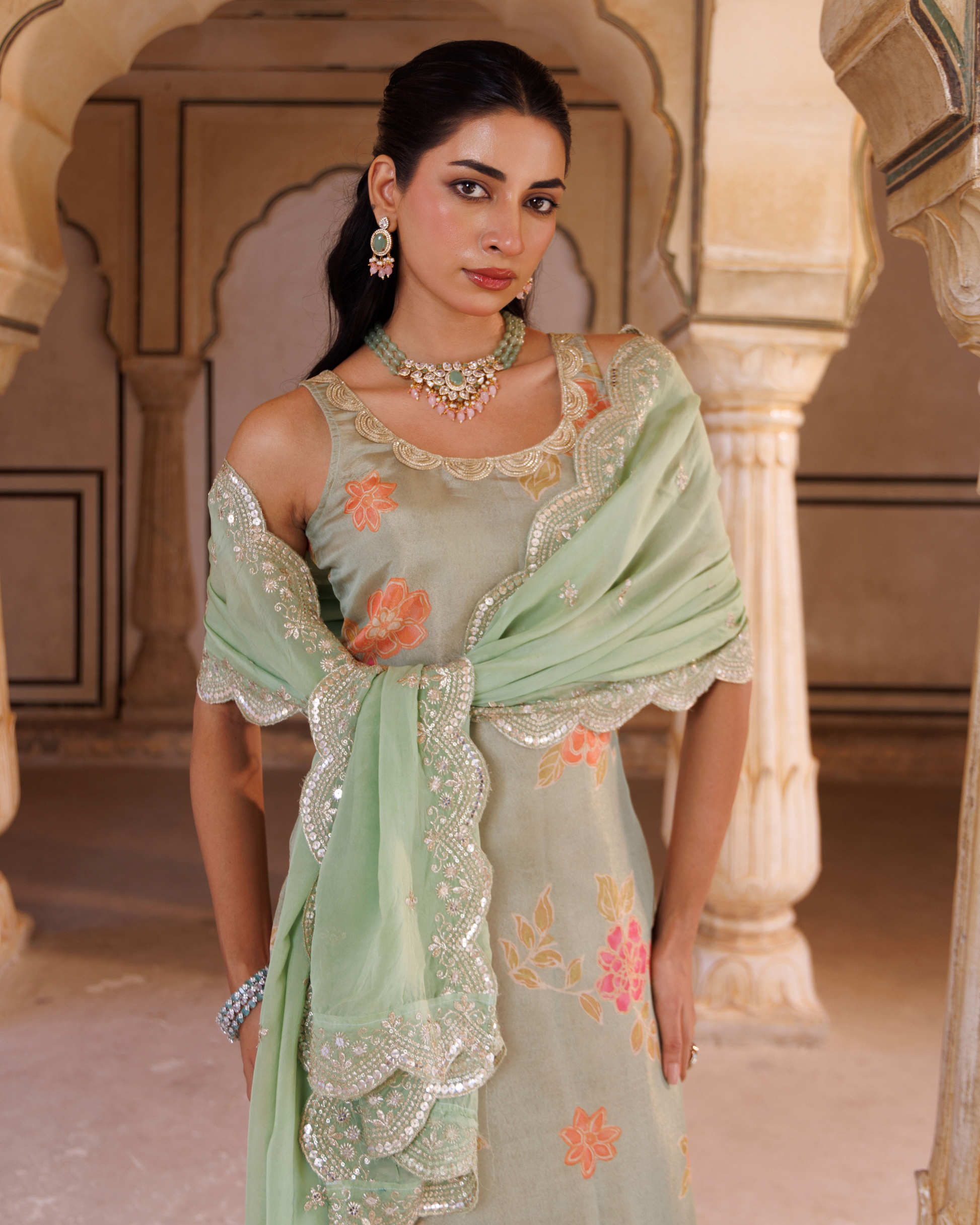 This pastel green tissue kurta set features delicate floral prints complemented by lace embellishments on the kurta and pants, creating a refined texture. The embroidered georgette dupatta adds an elegant finishing touch, making this ensemble ideal for sophisticated occasions and festive celebrations.
