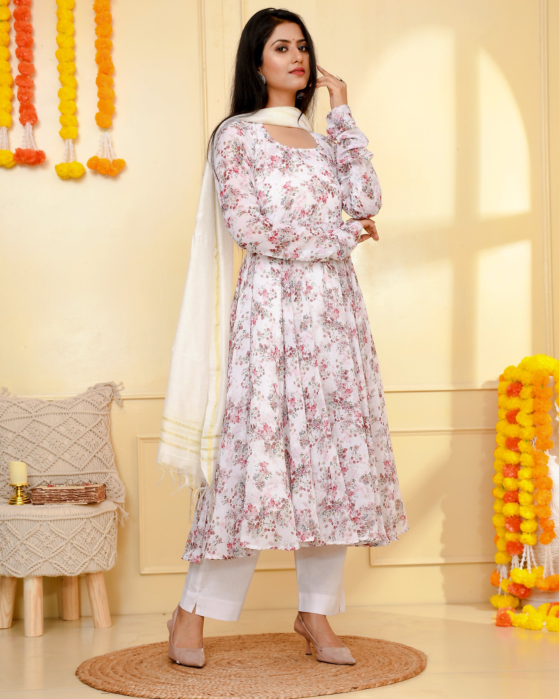 Gul white georgette suit set includes kurta, pant & dupatta.Twirl ready printed floral kurta is paired with white solid pant.