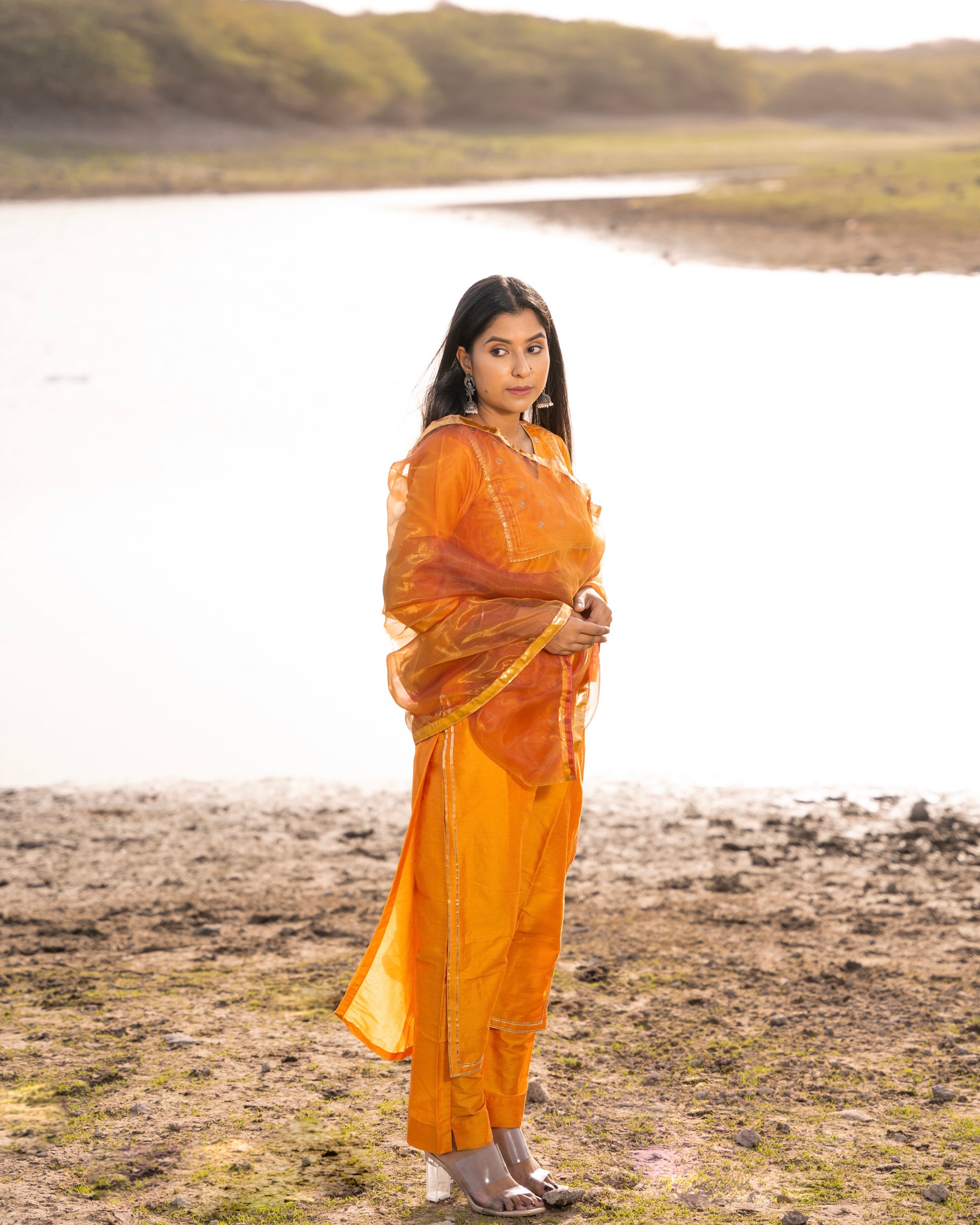 This suit set is made with mustard colour Jam cotton silk fabric and crafted with aari embroidery. It is a must have three piece suit set including kurta,pant and dupatta.