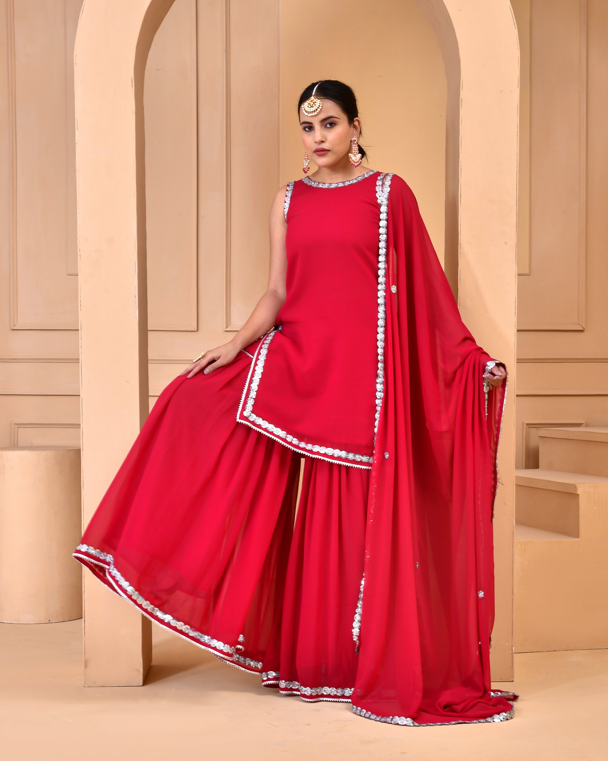 Sharara Description : Georgette fabric flared sharara with sequin lace details.