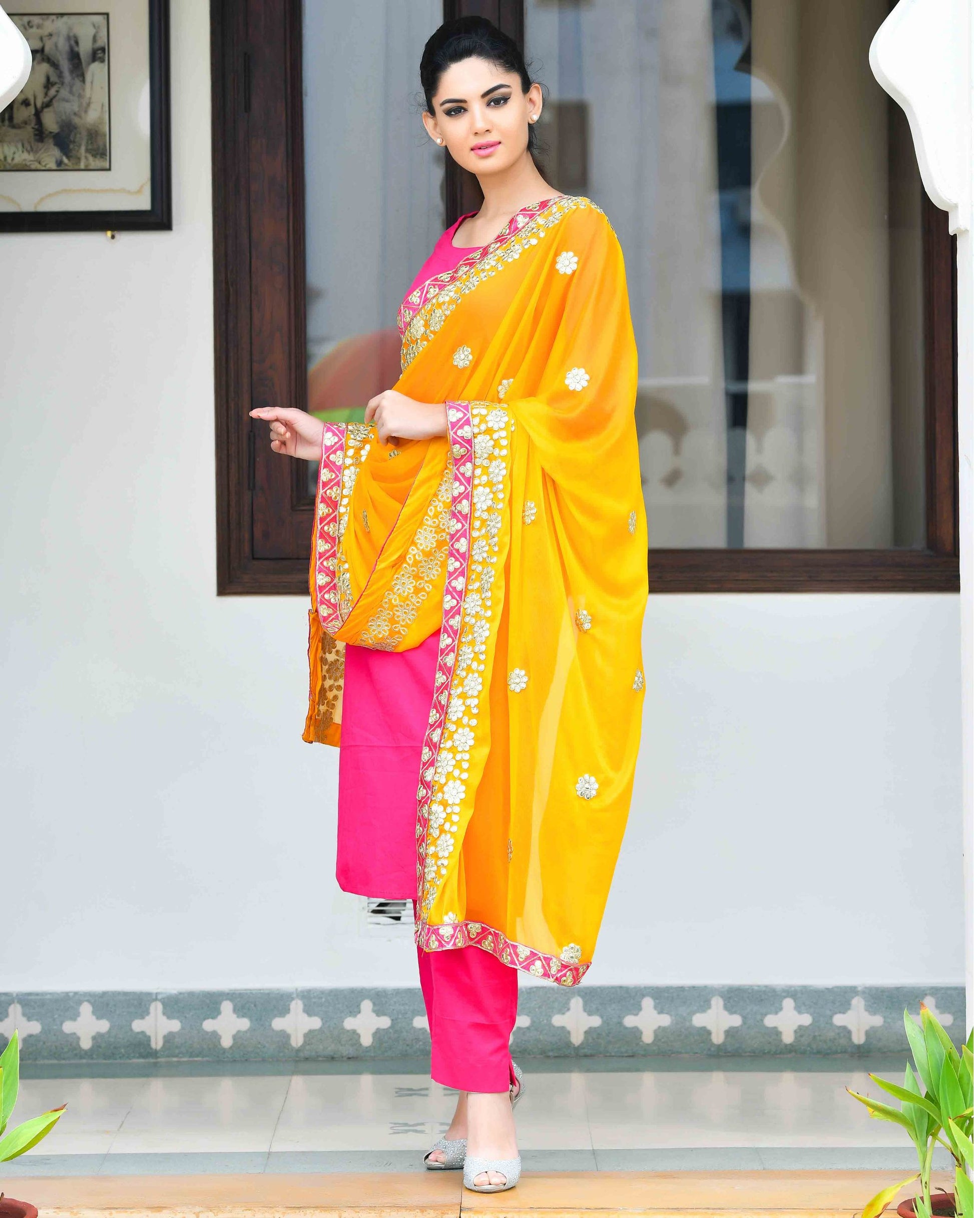 Brighten your day with this stunning suit set. This suit set comes with a vibrant rani pink colour kurta and pant & paired with a beautiful haldi yellow georgette dupatta. Unique contrast colour scheme used in this outfit makes it a must have wardrobe staple .