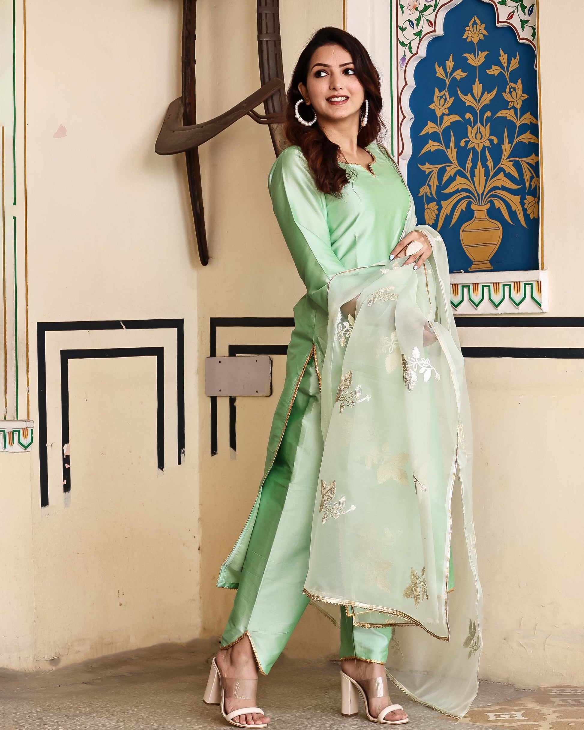 Kurta details : The kurta is crafted with taffeta silk fabric and has gota details.