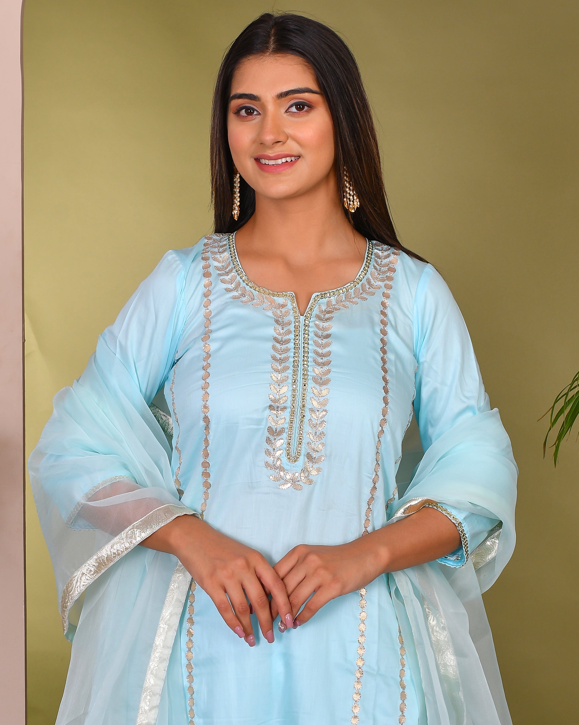 Made with airy and lightweight cotton silk fabric, this Megha Gota Patti Suit Set comes in a pastel blue hue, detailed with exquisite handcrafted Gota Patti work. Perfect for traditional settings, the soothing colour and sheer organza dupatta will make you stand out in style.