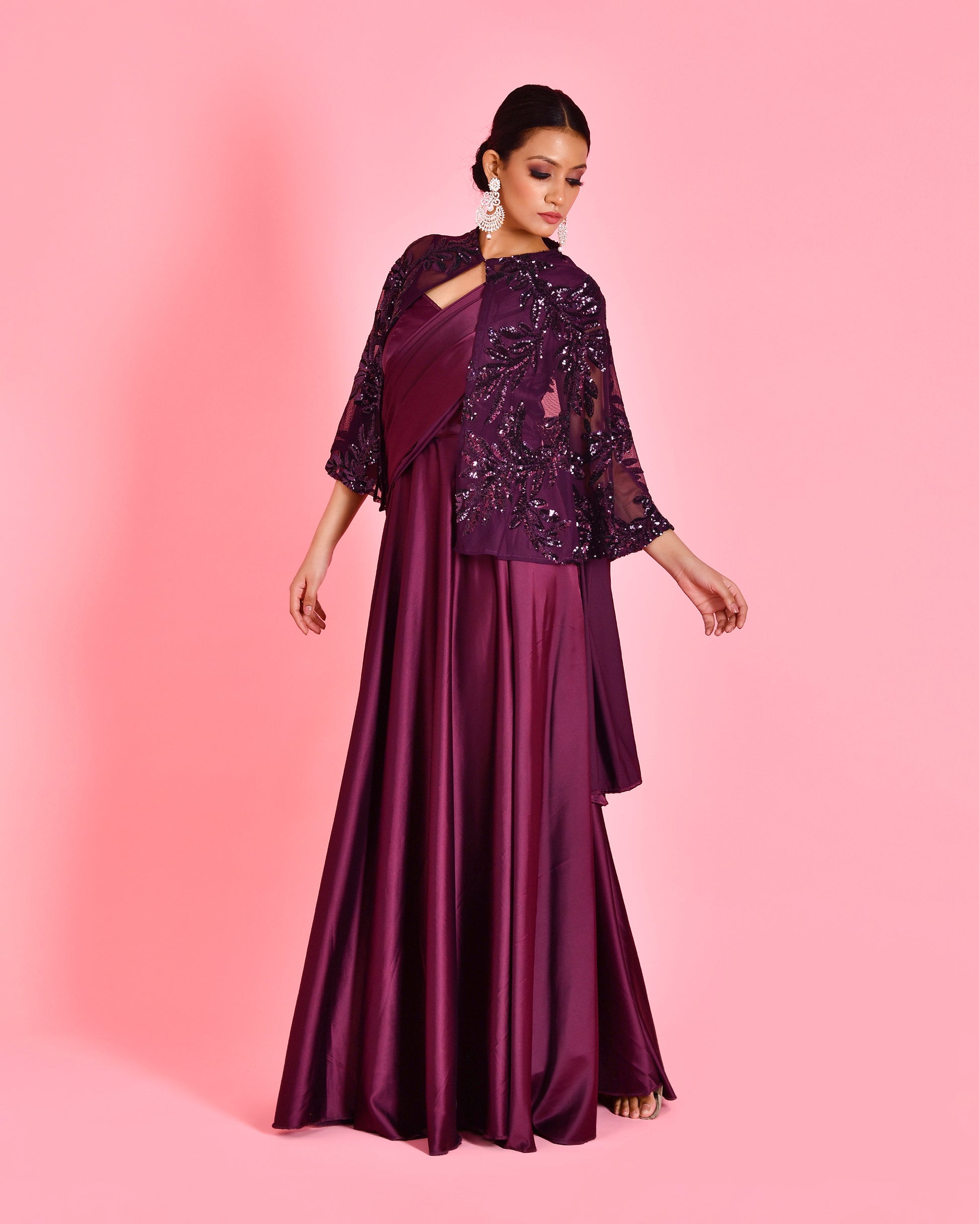 Fabric : Saree gown- Satin, Cape- Lycra net.