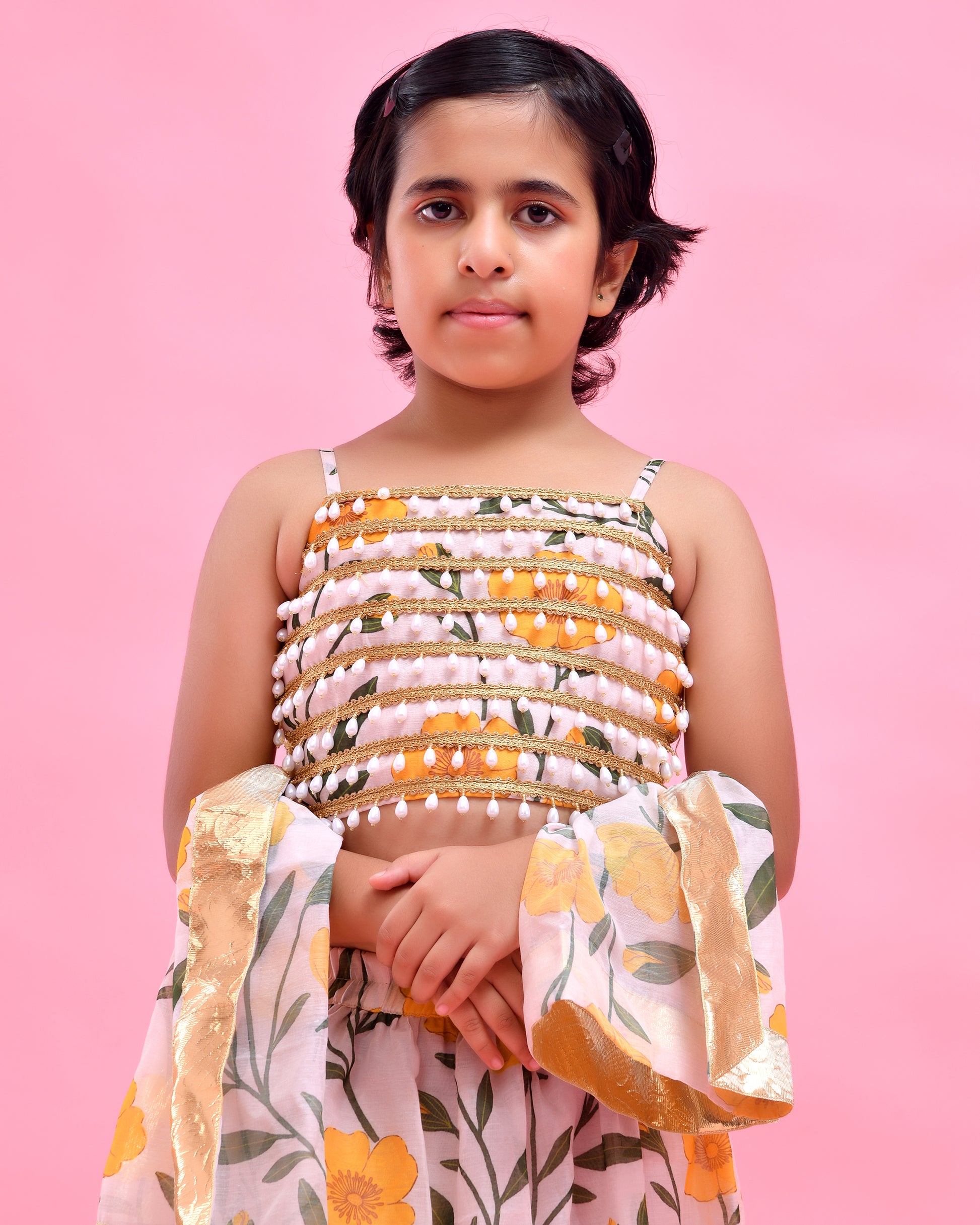 Crafted from premium Chanderi fabric, this off-white lehenga set features delicate floral prints that capture traditional elegance with contemporary flair. The set includes a beautifully printed lehenga, coordinating choli, and dupatta, offering a complete ethnic ensemble. Perfect for young girls who appreciate refined craftsmanship and timeless design, this piece combines authentic Indian textile heritage with modern sensibilities.