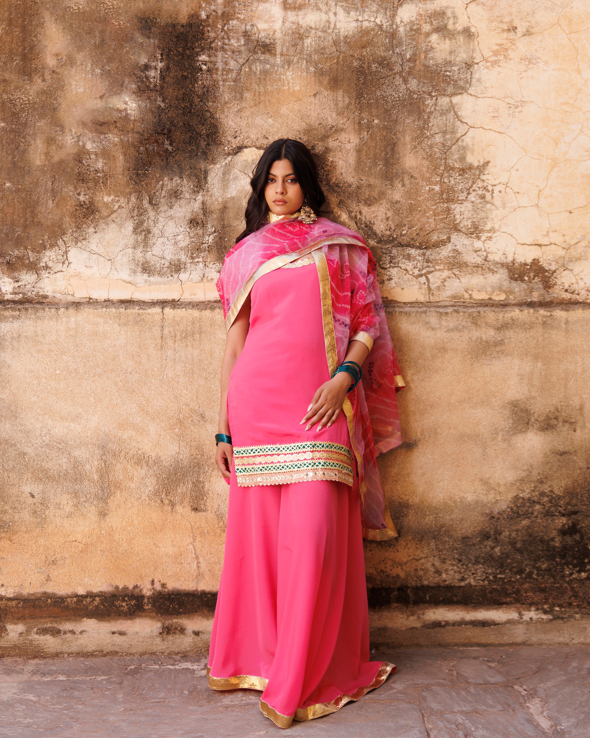 Sharara Description : Crepe fabric flared sharara with gota lace details.