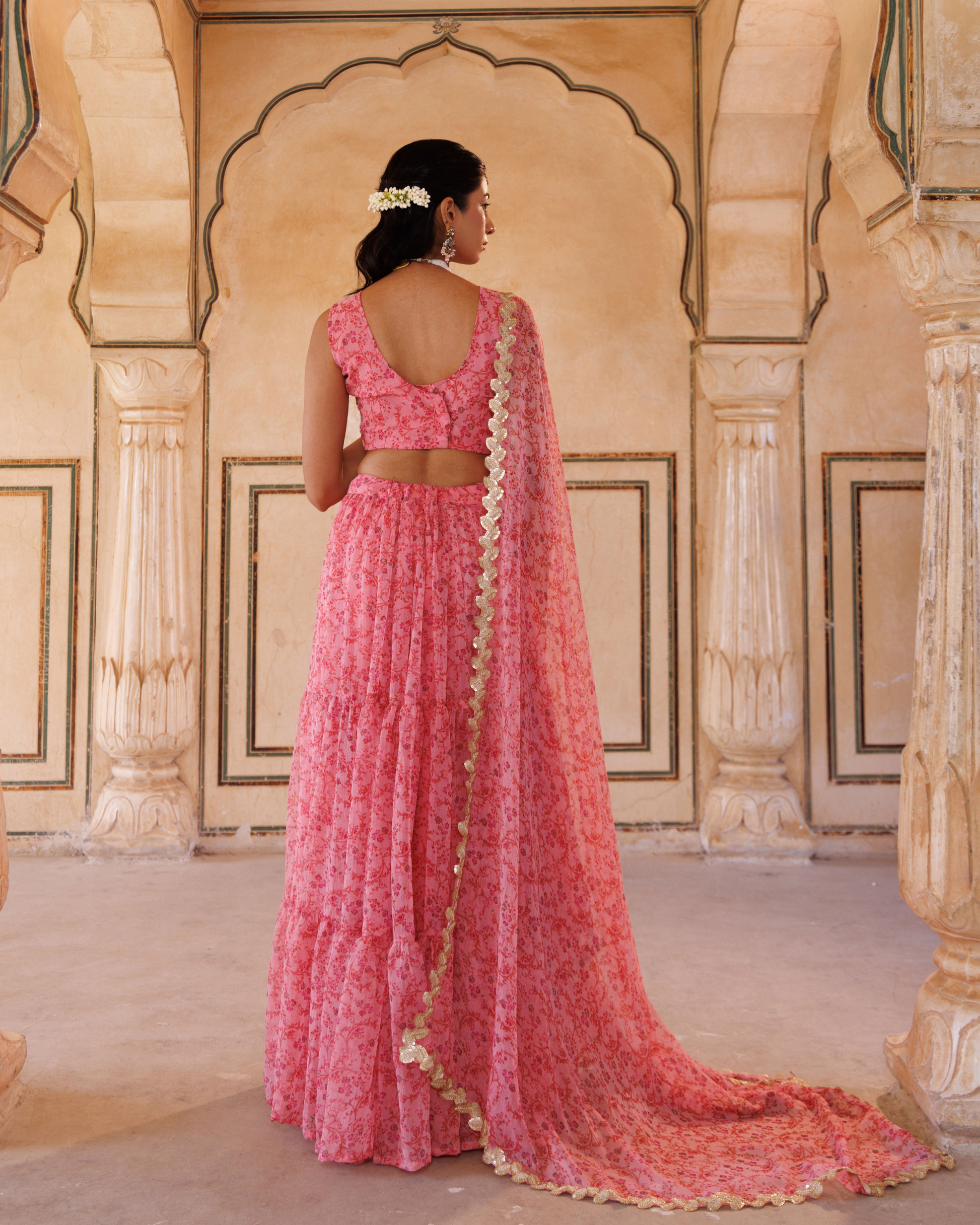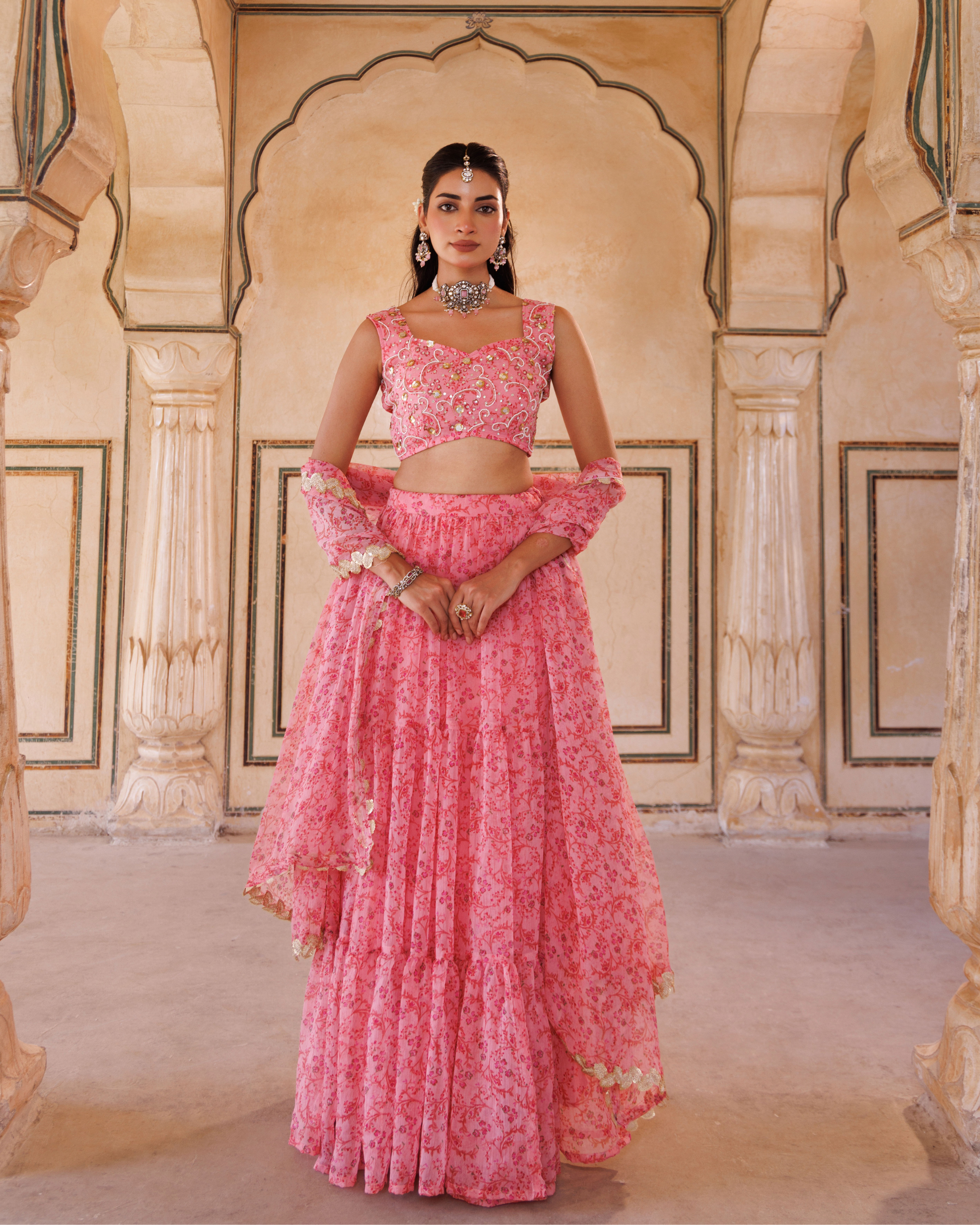 Elevate your ethnic wardrobe with this Pink Printed Chiffon Lehenga Set, showcasing a delicate floral pattern that enhances its feminine appeal. The hand-embroidered sleeveless blouse adds refined craftsmanship, while the layered chiffon lehenga provides graceful movement and volume. Completing the ensemble is a lace-embellished dupatta, offering subtle texture and elegance for festive occasions or celebrations. This set combines traditional artistry with contemporary design for a sophisticated and timeless look.