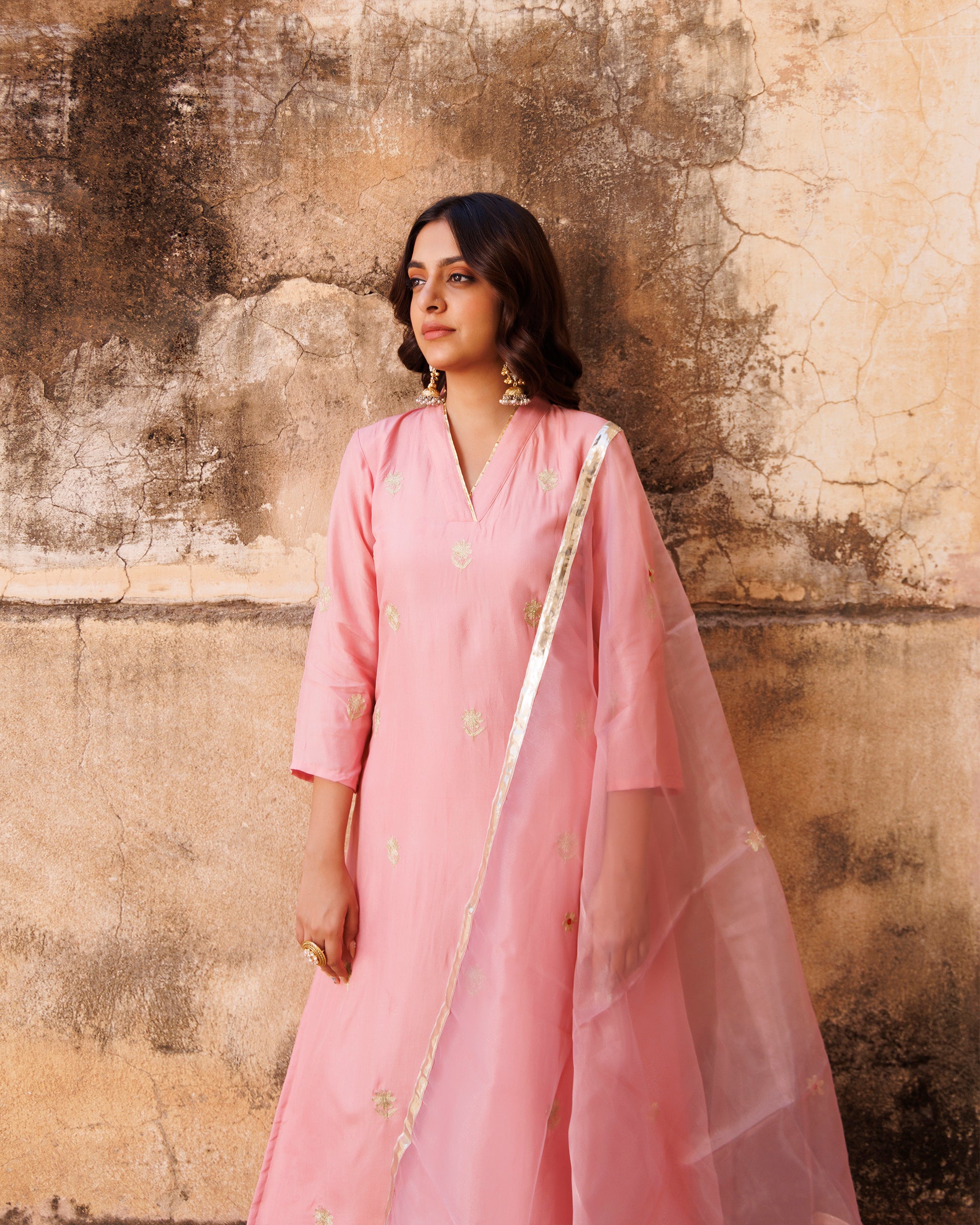 This Pink Uppada Silk Aari Embroidered Kurta Set is expertly crafted from high-quality silk, featuring intricate Aari embroidery. With its elegant design and luxurious fabric, this set is perfect for any formal occasion. The soft, lightweight material ensures comfort while the delicate embroidery adds a touch of sophistication. Upgrade your wardrobe with this must-have piece.