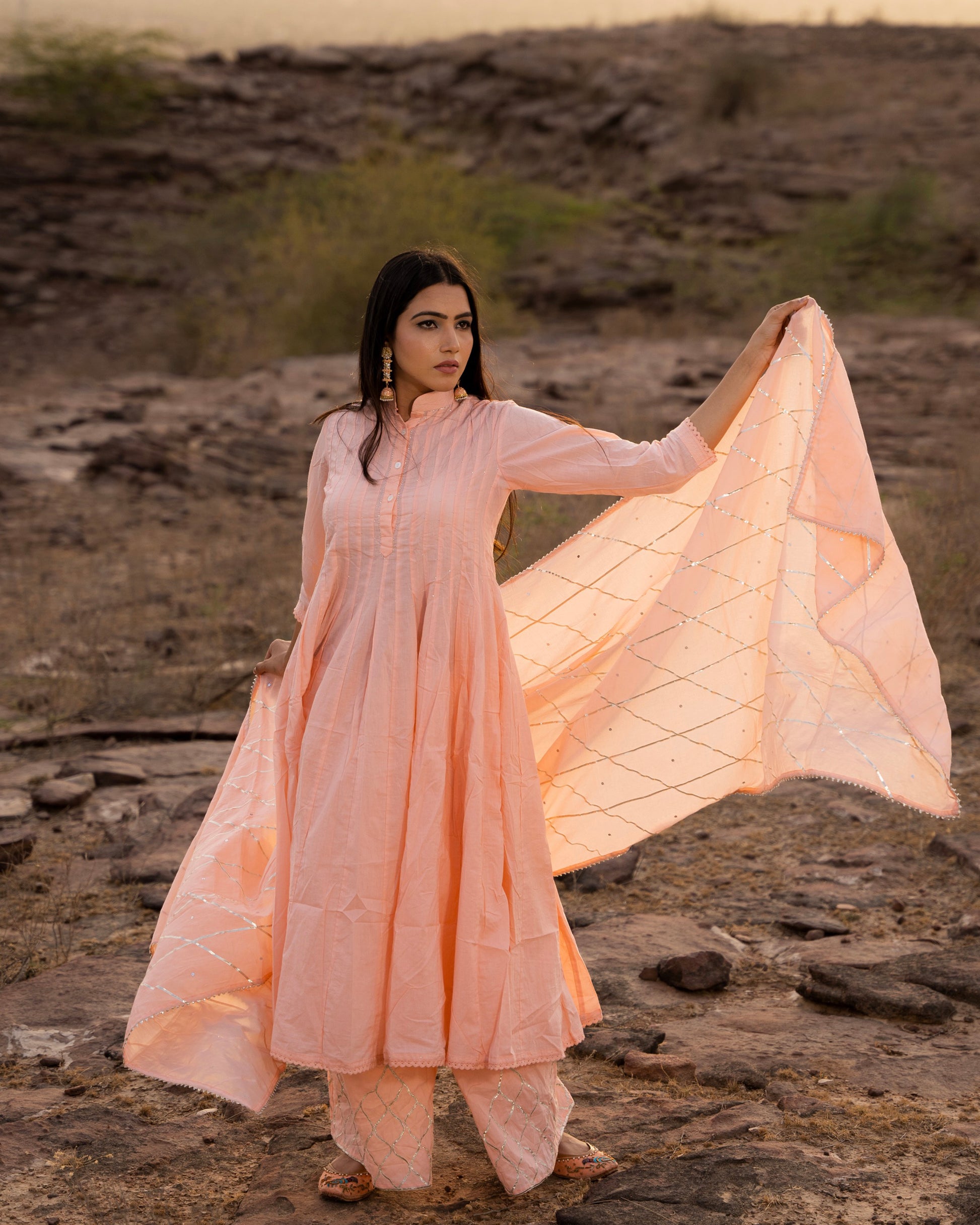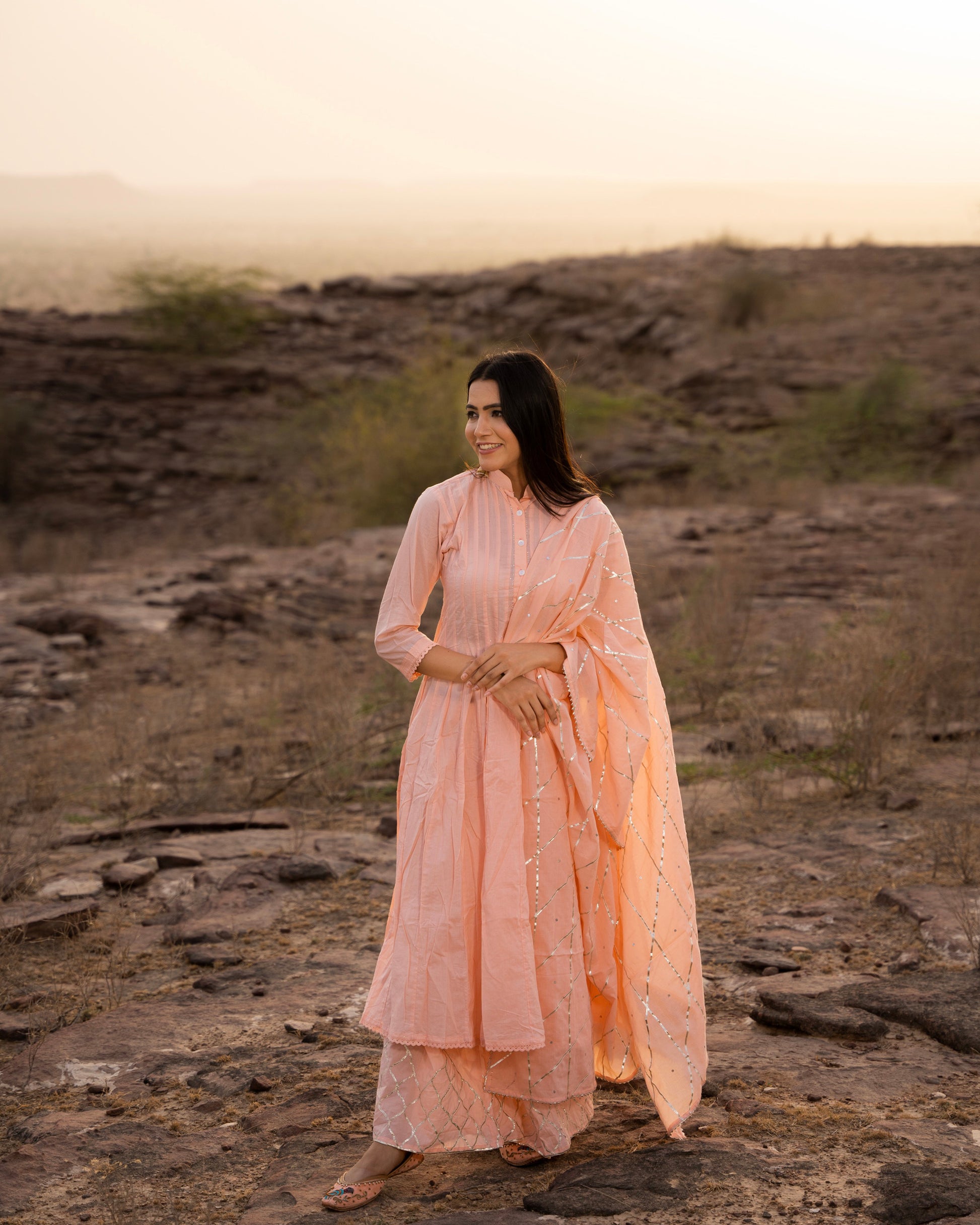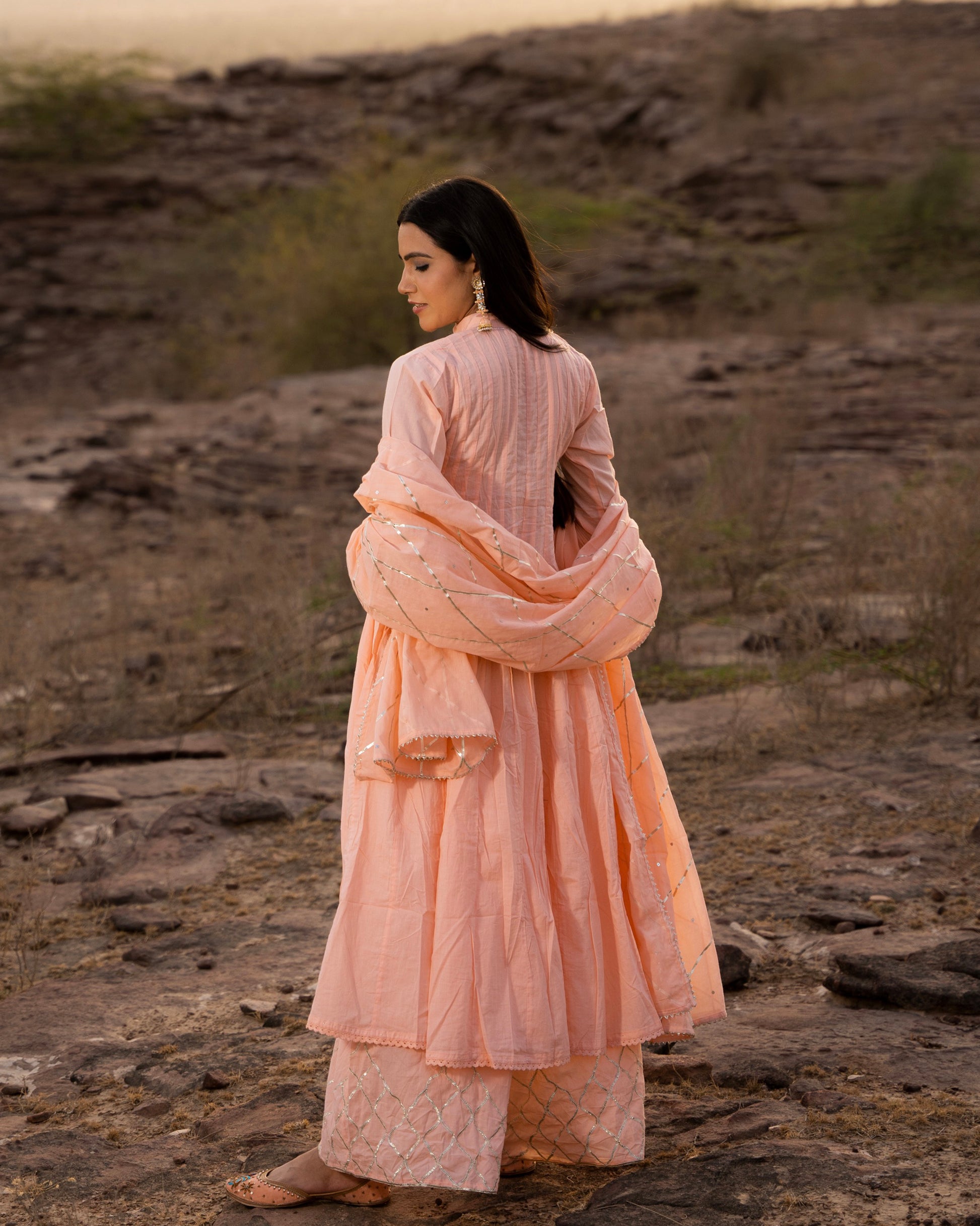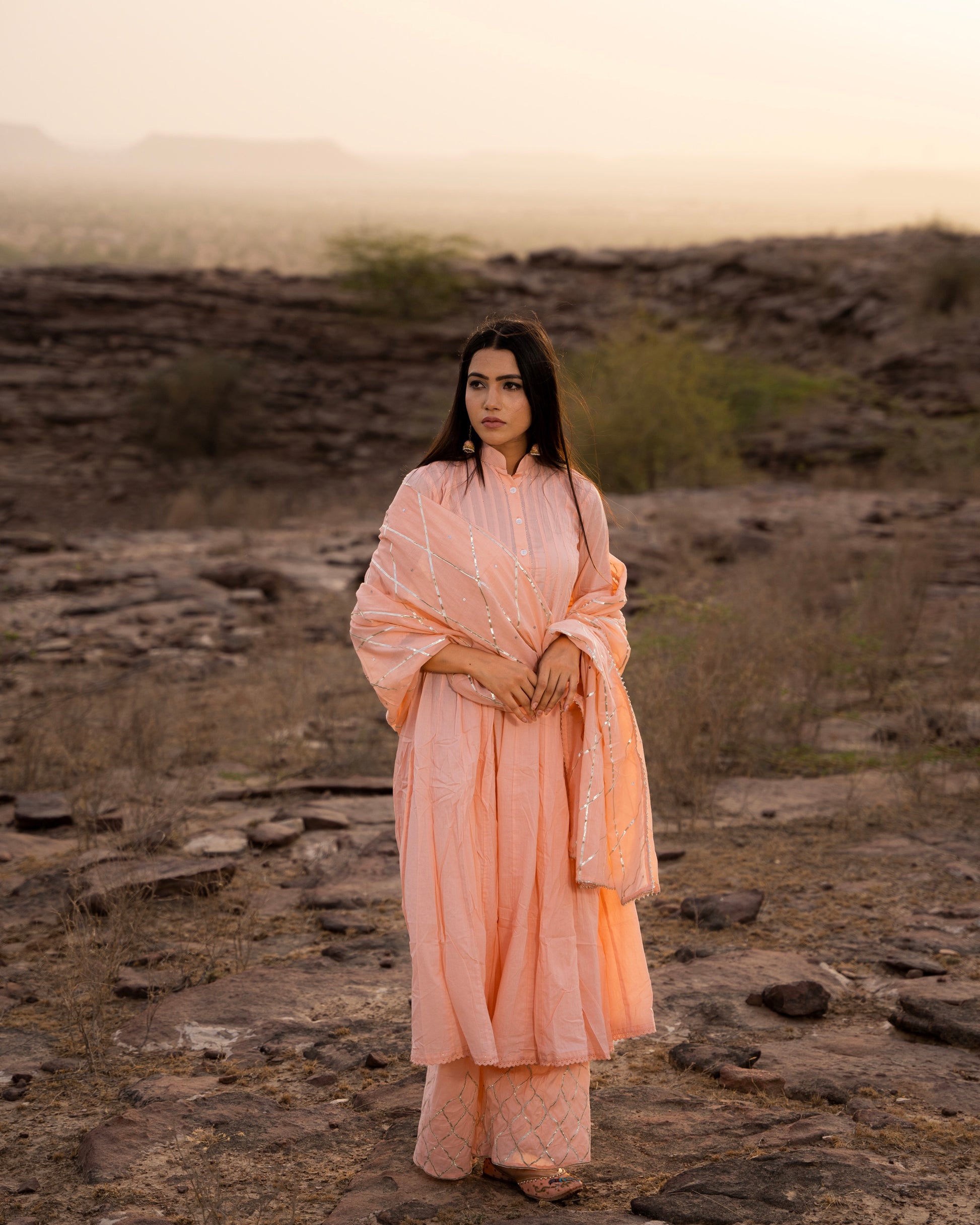 Kurta Description : Peach coloured kali pattern flared kurta with beautiful gota details and mukesh work handcrafted on it by skilled artisan.
