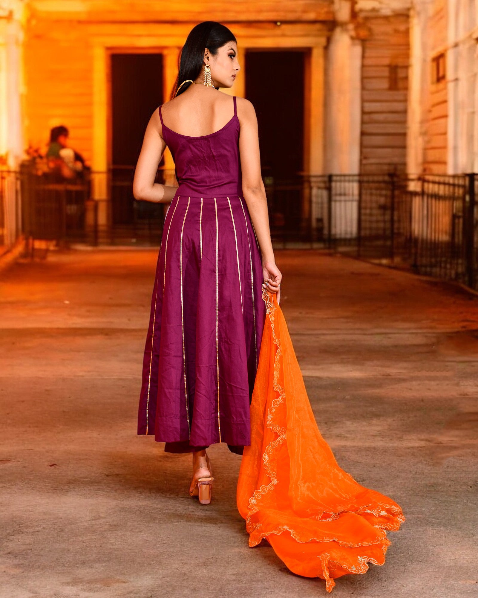 Experience the timeless elegance of our Purple Aari Embroidered Suit Set. This cotton silk anarkali features intricate gota details, while the contrast-colored aari embroidered dupatta adds a touch of sophistication. Elevate your fashion game with this expertly crafted outfit.