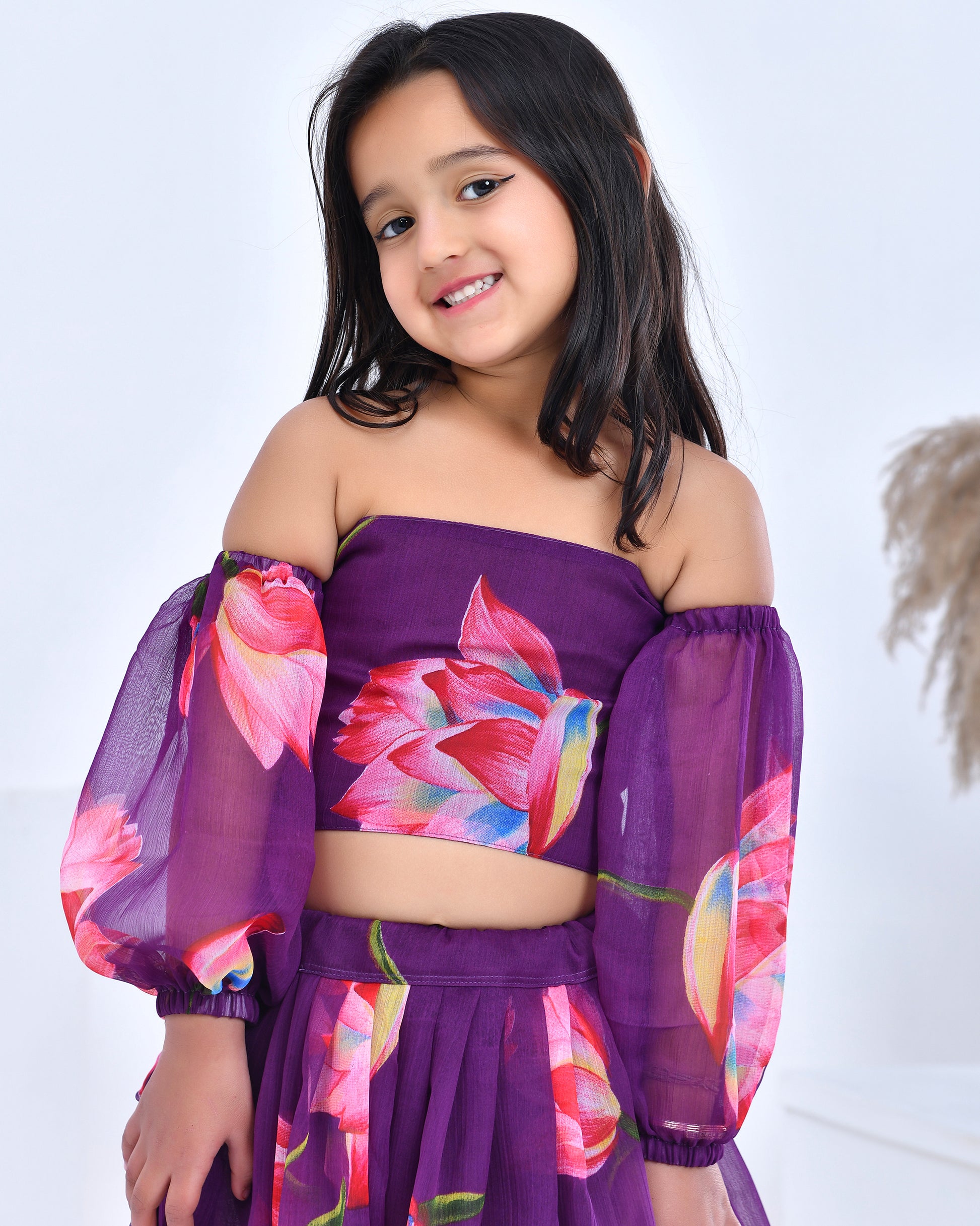 This Purple Chiffon Printed Blossom Lehenga Set combines vibrant colors and a delicate floral design for a stunning girls' outfit. Made from high-quality chiffon, this set is lightweight and comfortable for all-day wear. Perfect for special occasions and photoshoots, this set will make your little one stand out in style.