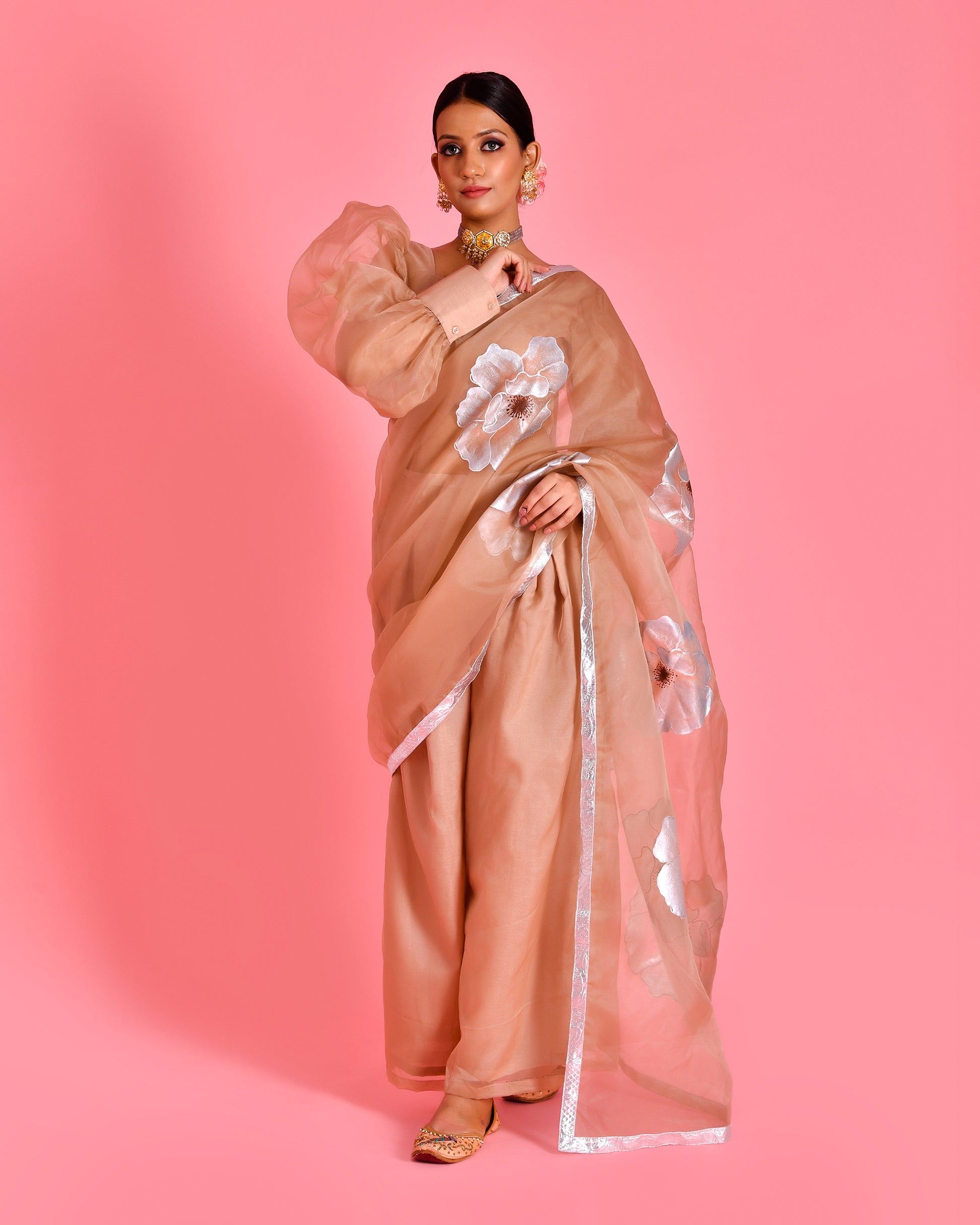 Unleash your inner fashionista with our RAAS HAND PAINTED FUSION SAREE. This stunning saree features a modern twist with a palazzo and attached pallu, making it comfortable and stylish. The beautiful hand painted designs add a unique touch, and the included blouse completes the look. Elevate your wardrobe with this one-of-a-kind saree today.