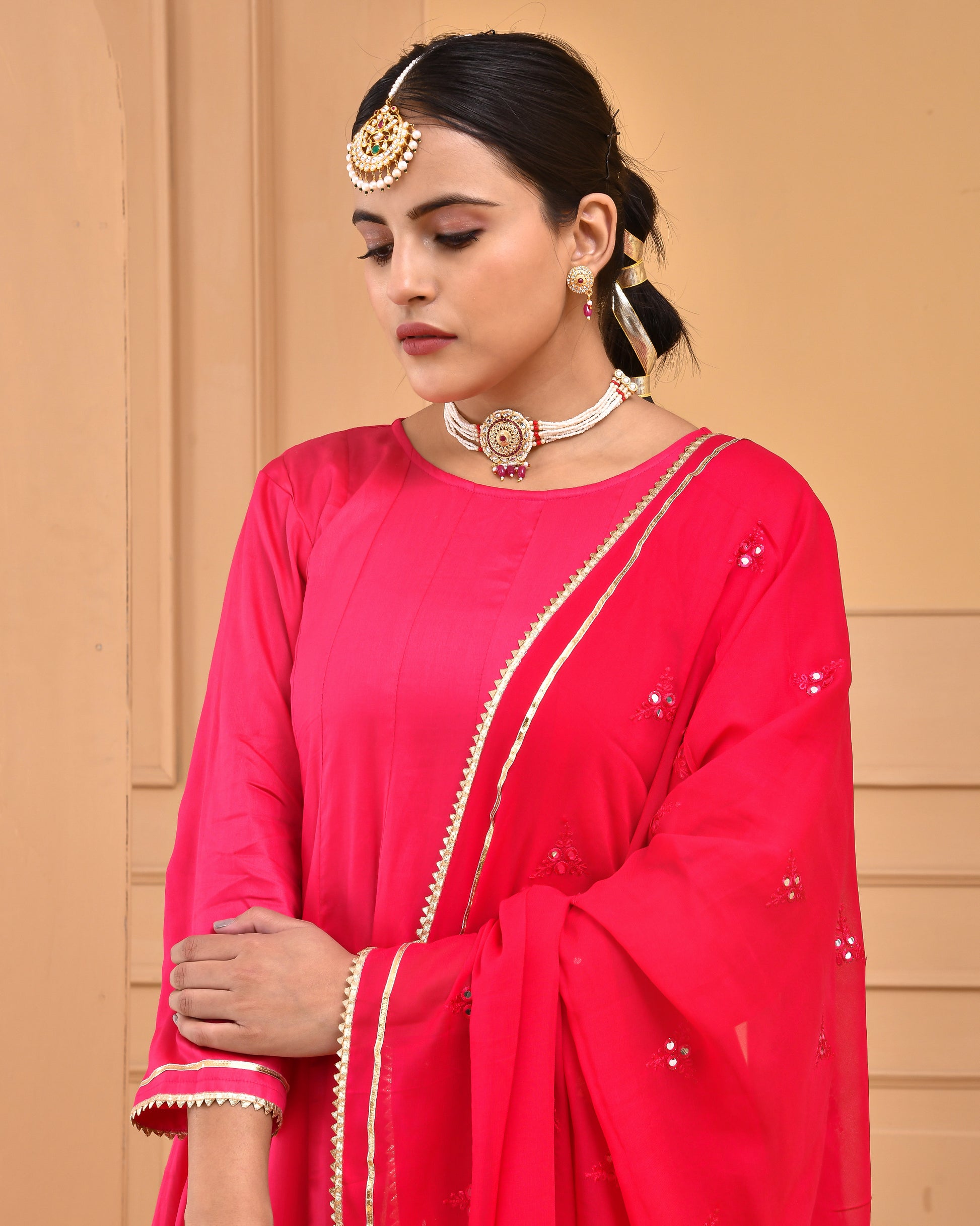 Elevate your style with our RUBY PINK ANARKALI SET. This ANARKALI SUIT SET features stunning MIRROR WORK on a delicate georgette dupatta and comes with a complementary POTLI BAG. Perfect for any occasion, this set will make you stand out in a crowd while exuding elegance and grace.