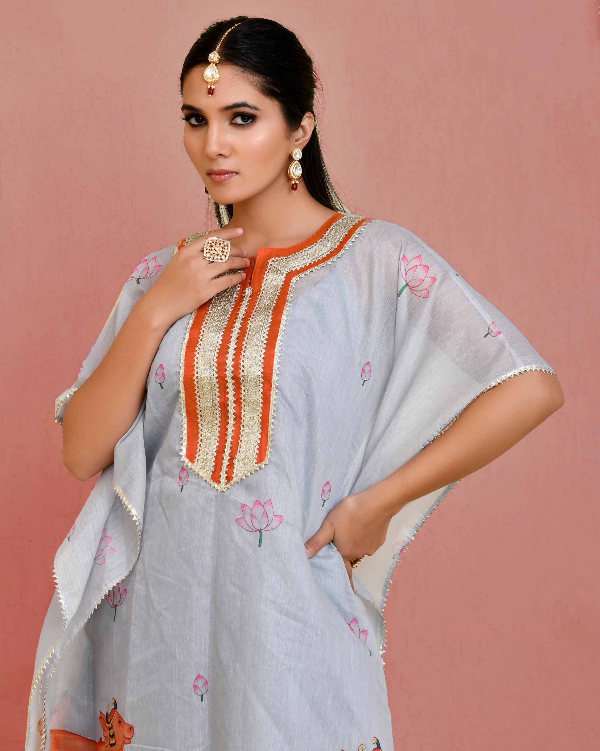 Expertly crafted in India, the SARANG KAFTAN SET is a stunning combination of traditional pichwai printing and modern design. Made from high-quality chanderi fabric, this kaftan and pant set features intricate lace embellishments for added elegance. Embrace the beauty of Indian textiles with this grey pichwai printed set.