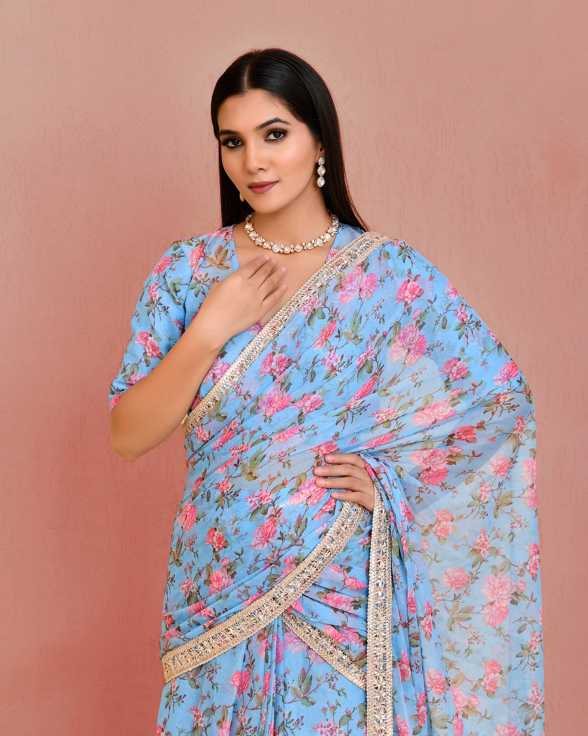 Expertly crafted for convenience and elegance, the SAROJ PRE-STITCHED SAREE is made from a lightweight georgette fabric that drapes beautifully. The vibrant blue saree features intricate floral prints, making it a perfect choice for any occasion. Its pre-stitched design and wrap choli blouse provide a hassle-free experience, allowing you to effortlessly stand out in style.