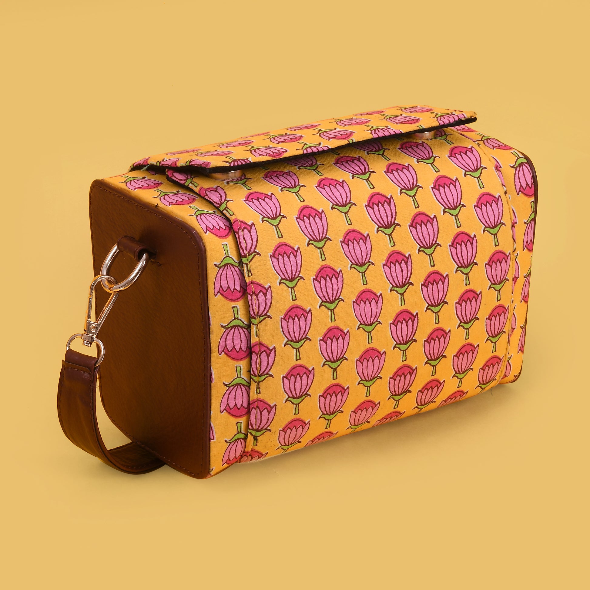 Yellow hand block printed floral bag. It is a unique pattern ,box style bag .Add this in your wardrobe and be style icon.