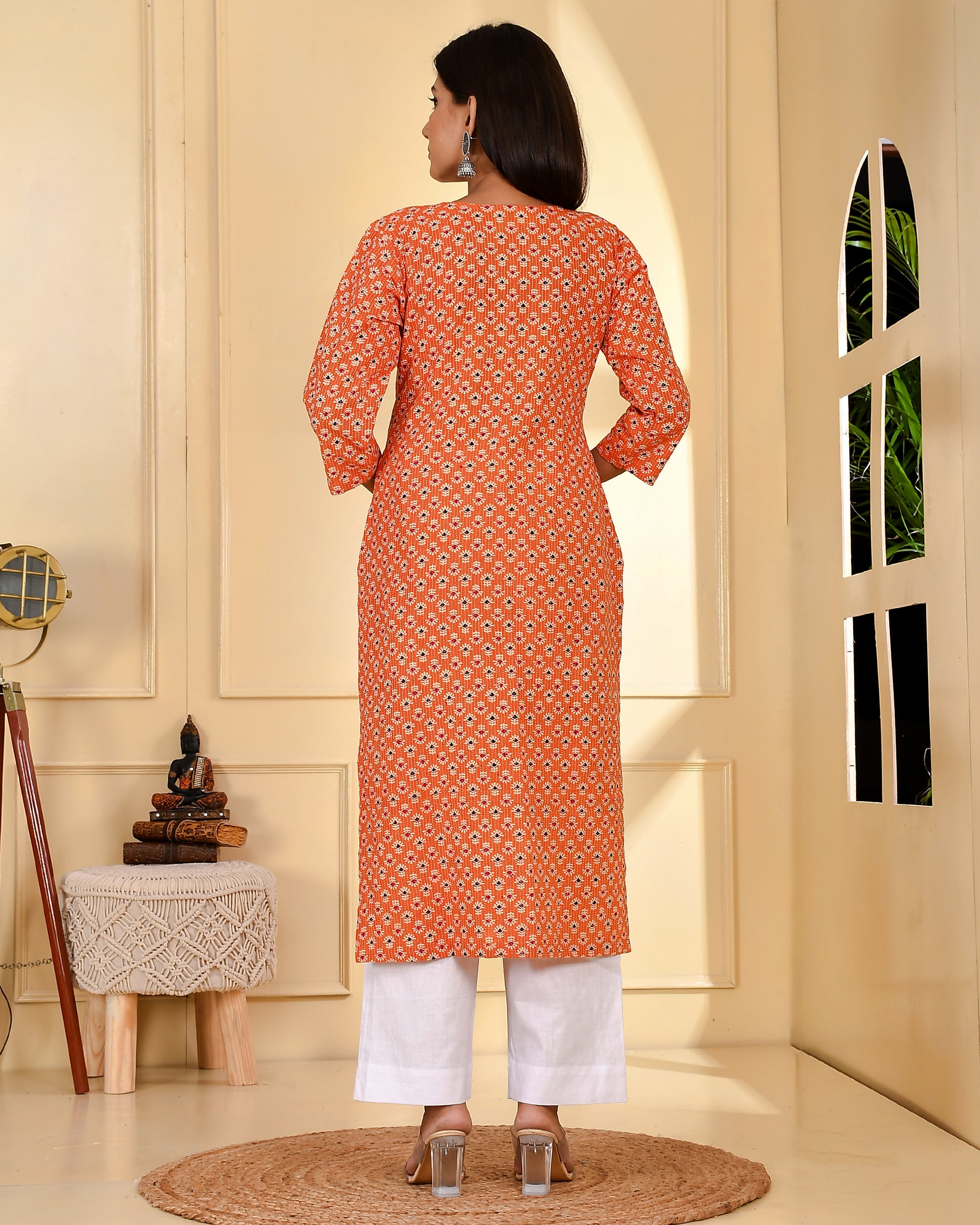 Kurta description : It is an ajrakh hand block printed kurta made with orange colour , katha work , cotton fabric.