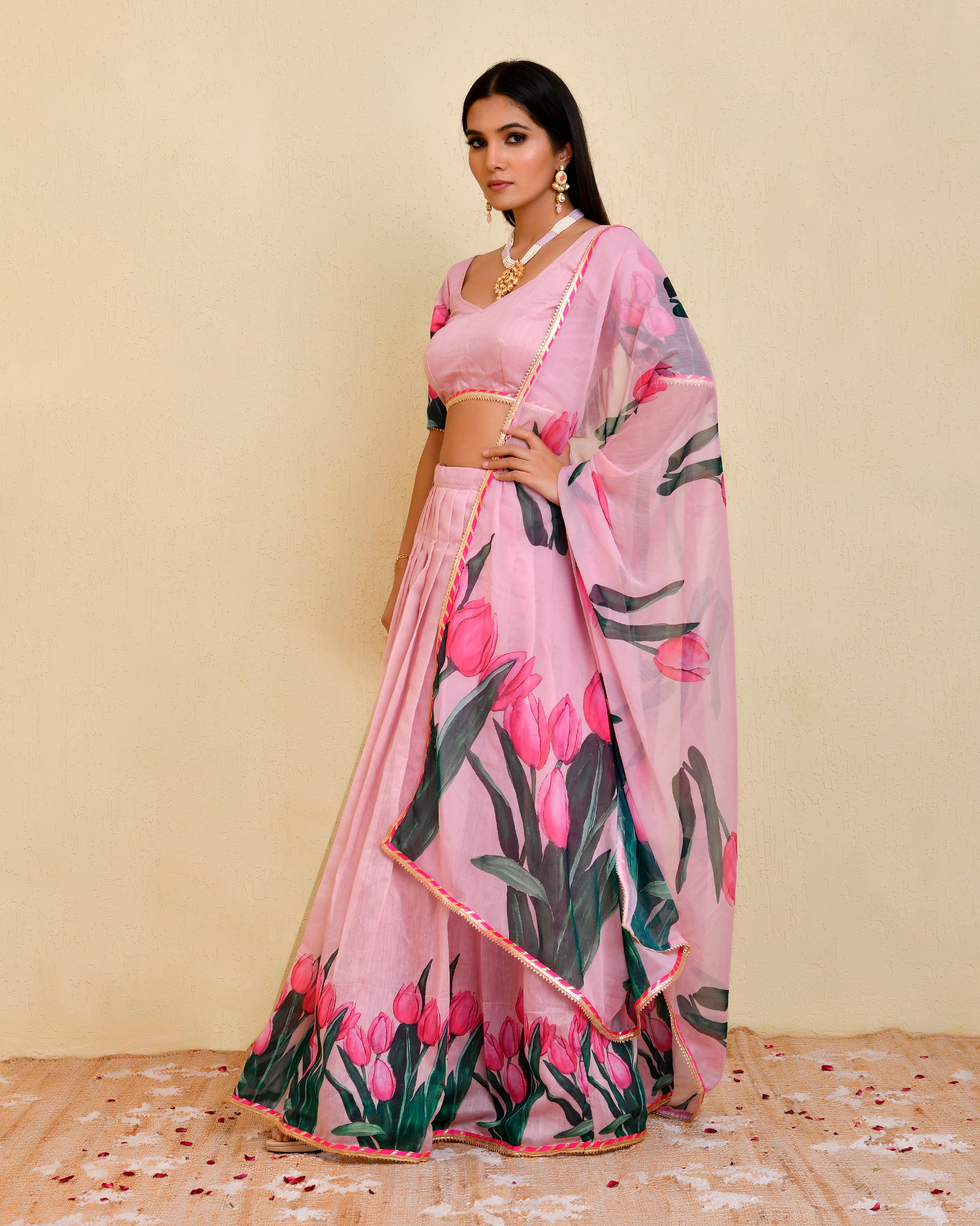 This floral chanderi lehenga set offers a stunning and sophisticated look. Made from high-quality chanderi fabric, this set is lightweight and comfortable to wear. The beautiful floral print adds a touch of elegance, making it perfect for any special occasion. Upgrade your wardrobe with this elegant lehenga set today.