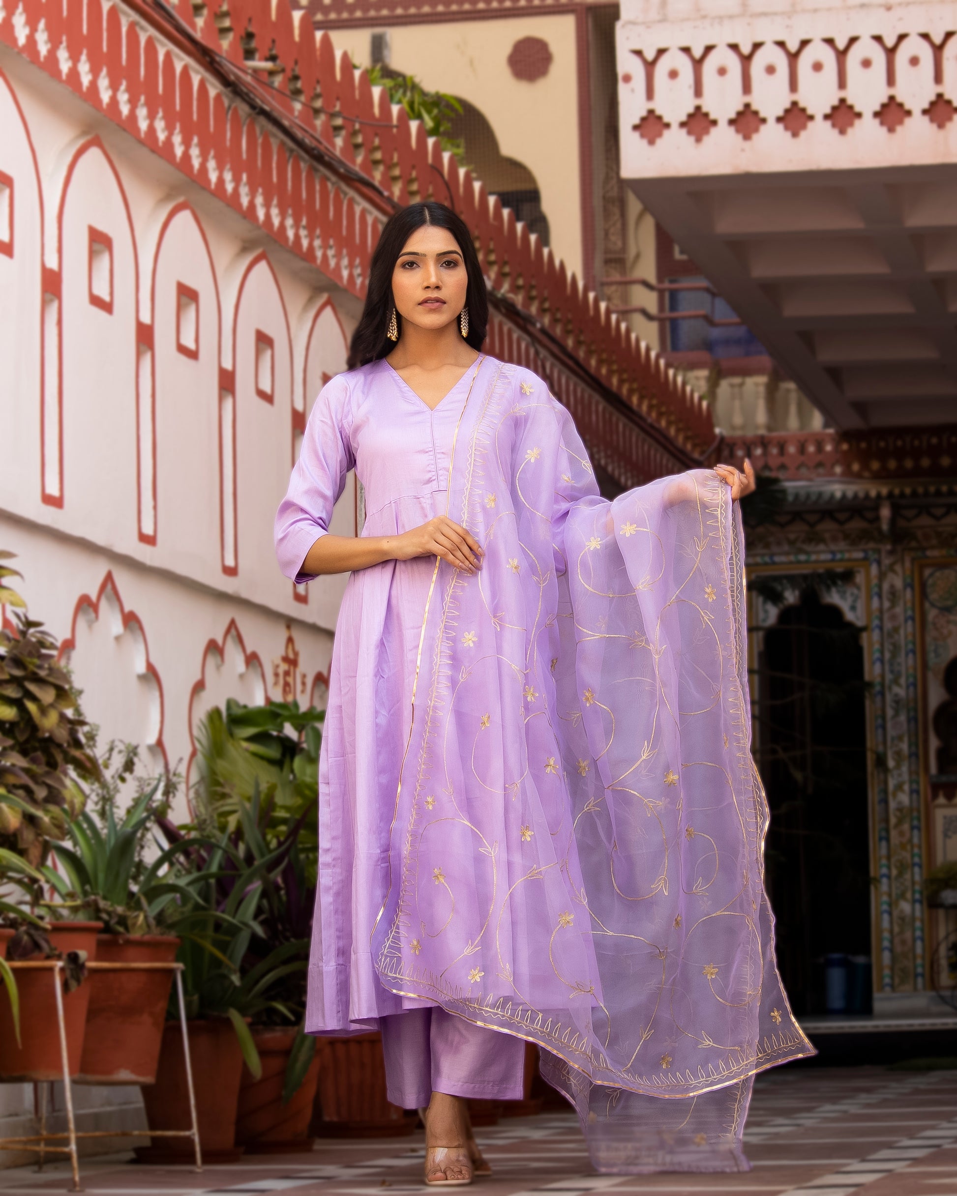This three piece set comes with a twirl ready flared kurta, similar toned moderately flared pant, and a beautiful similar coloured dupatta with aari embroidery all over it. The dupatta of this monochrome suit set has aari embroidery jaal work done by the skilled kaarigars. Tailored with perfection, this suit set stands for sophistication. Add this pastel hued outfit to your summer wardrobe and look fabulous this summer!!