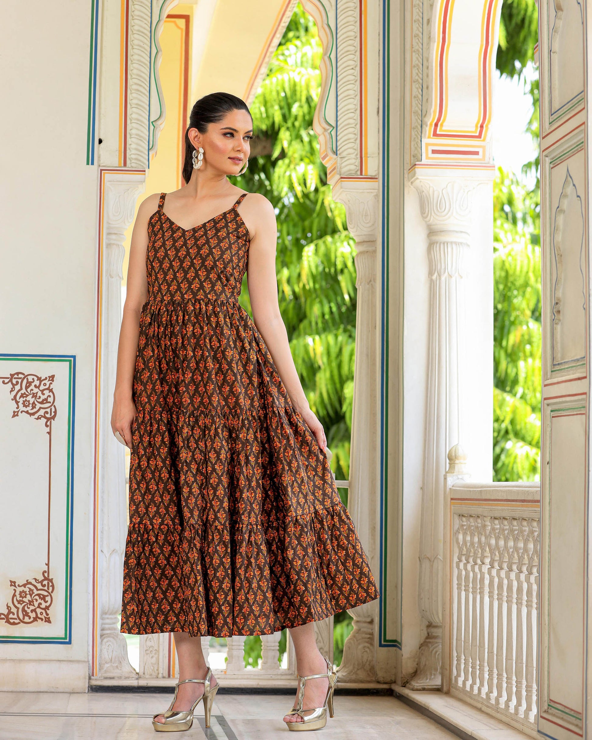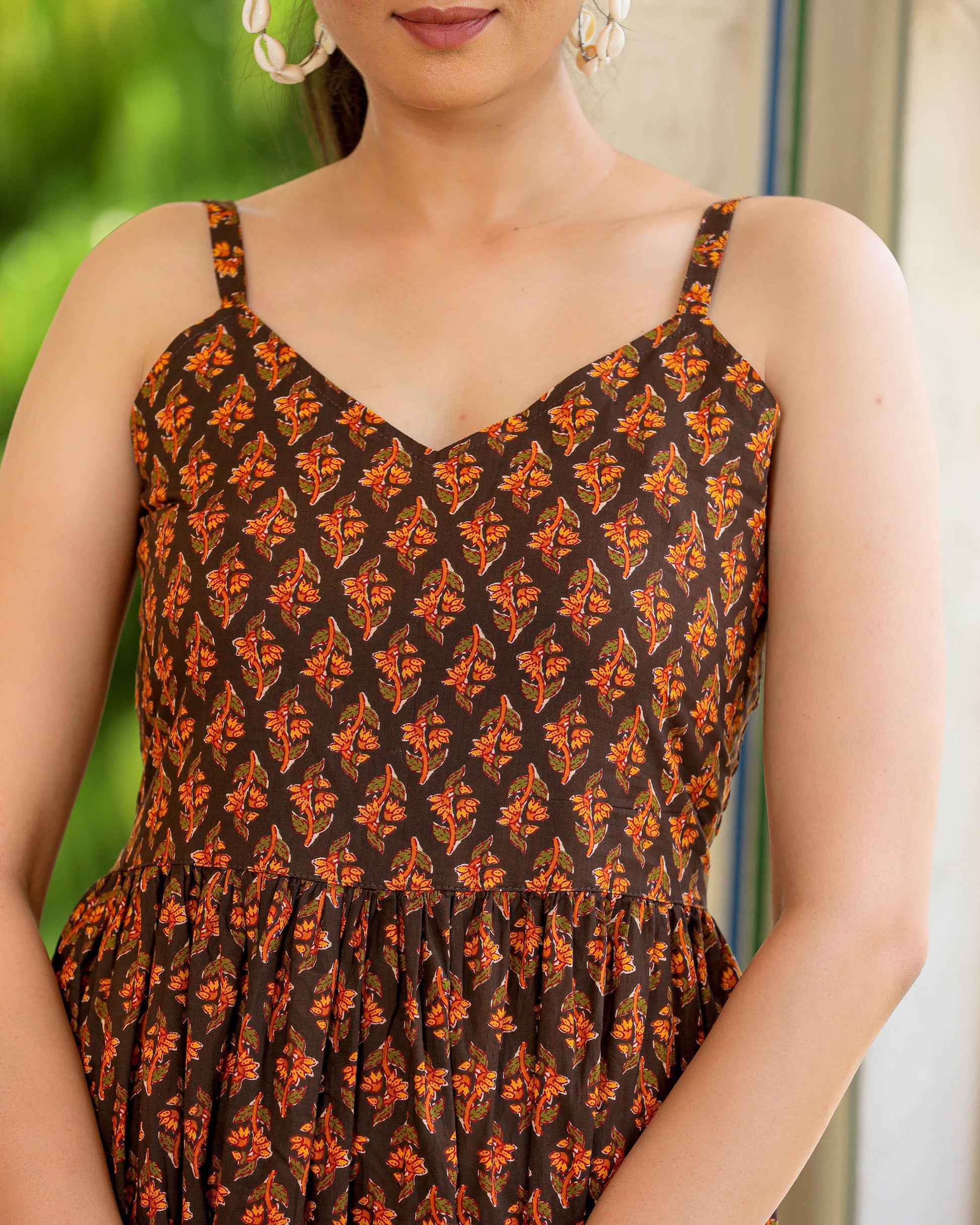 This beautiful dress features a floral print with a walnut hue, crafted from lightweight cotton. Its midi length is perfect for all kinds of occasions. Its relaxed cut is flattering and comfortable, making it a great choice for your wardrobe.