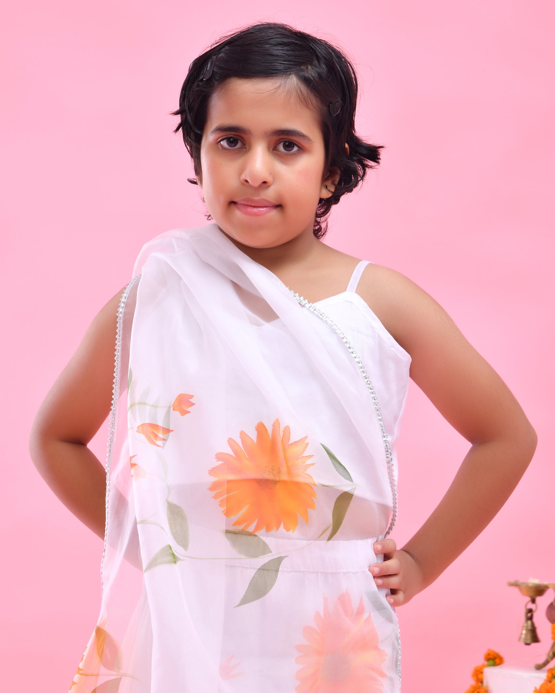 Celebrate your daughter's special moments in this enchanting hand-painted organza lehenga set, featuring bold orange floral prints. The intricate floral motifs are expertly hand-painted, creating a one-of-a-kind aesthetic that blends traditional artistry with contemporary design. Crafted from premium organza, the fabric offers a graceful drape and breathable comfort, making it perfect for extended celebrations. The sophisticated color palette and botanical detailing make this set ideal for weddings, festivals, and cultural events.