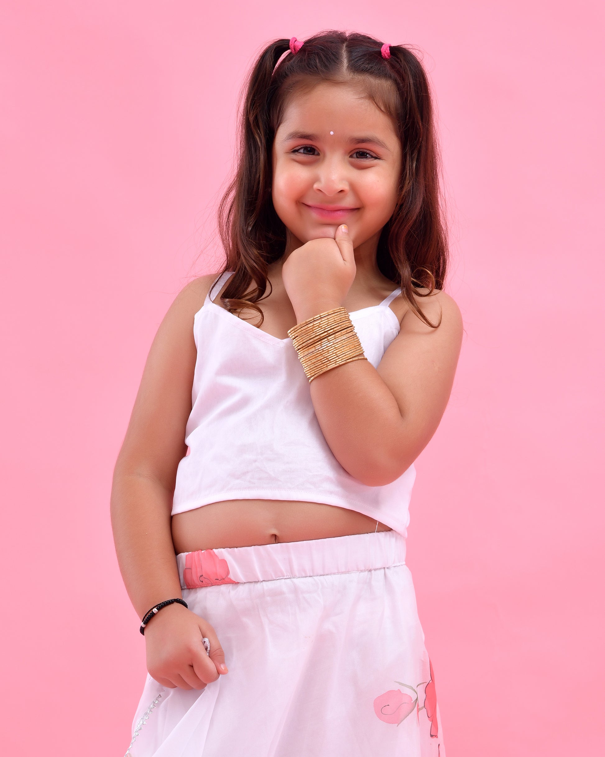 Introduce your daughter to timeless elegance with this stunning white organza lehenga, featuring meticulously hand-painted floral designs. The delicate botanical motifs showcase traditional artisanal techniques, ensuring each garment is distinctly unique. Ideal for weddings, festivals, and celebrations, this lehenga allows girls to express their individual style while honoring cultural heritage. A cherished addition to any festive wardrobe.