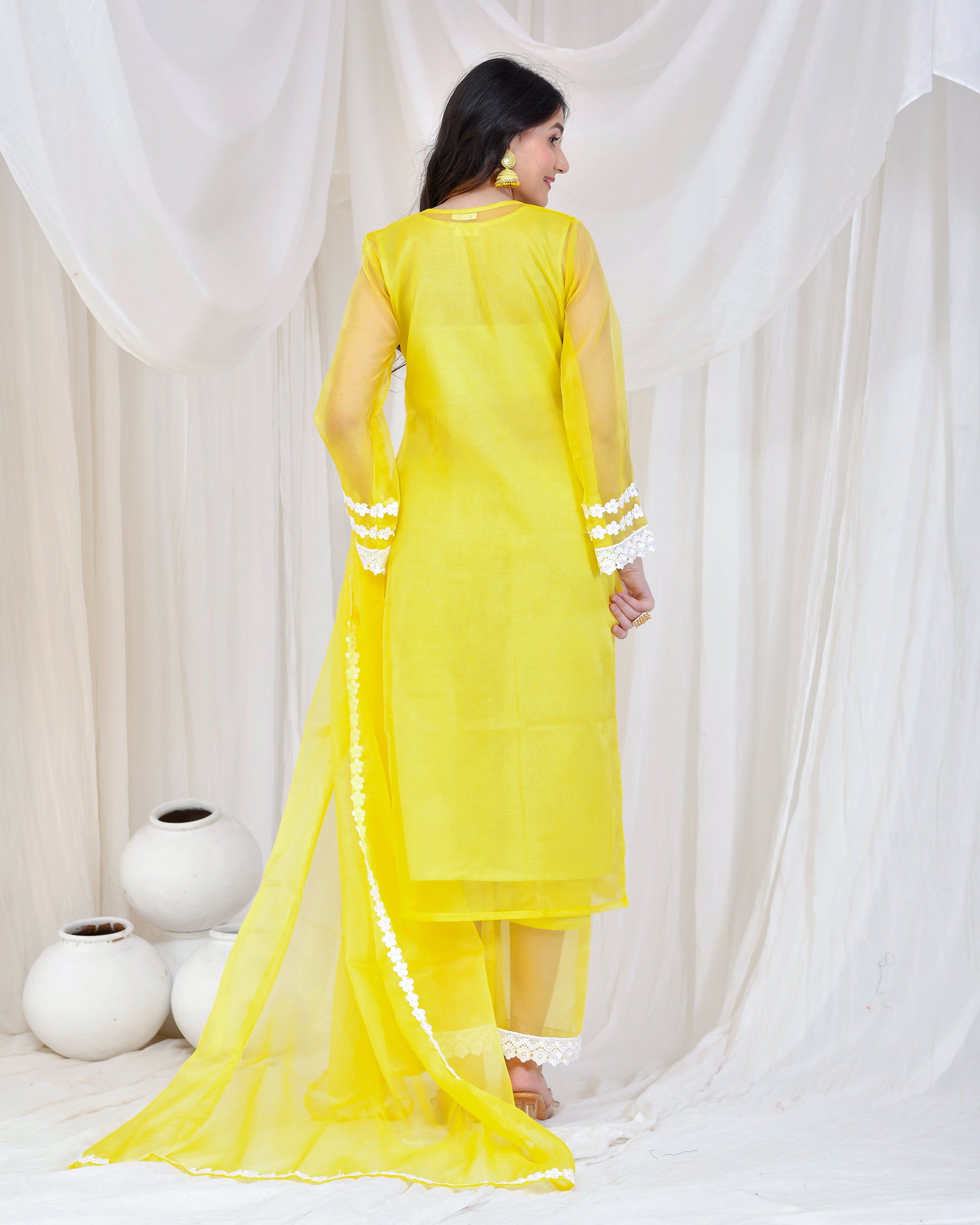 Elevate your style with our elegant Yellow Organza Suit Set. This 4-piece set features intricate lace work, adding a touch of sophistication to your look. Perfect for any formal occasion, you'll feel confident and empowered in this unique and chic ensemble. Upgrade your wardrobe with this must-have statement piece.